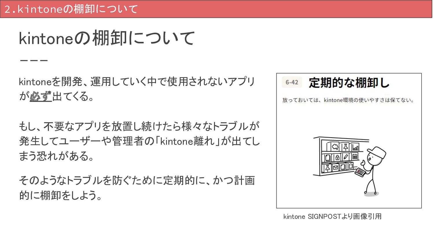 kintoneの棚卸について kintoneを開発、運用していく中で使用されないアプリ が必ず出てくる。 もし、不要なアプリを放置し続けたら様々なトラブルが 発生してユーザーや管理者の「kintone離れ」が出てし まう恐れがある。 そのようなトラブルを防ぐために定期的に、かつ計画 的に棚卸をしよう。 2.kintoneの棚卸について