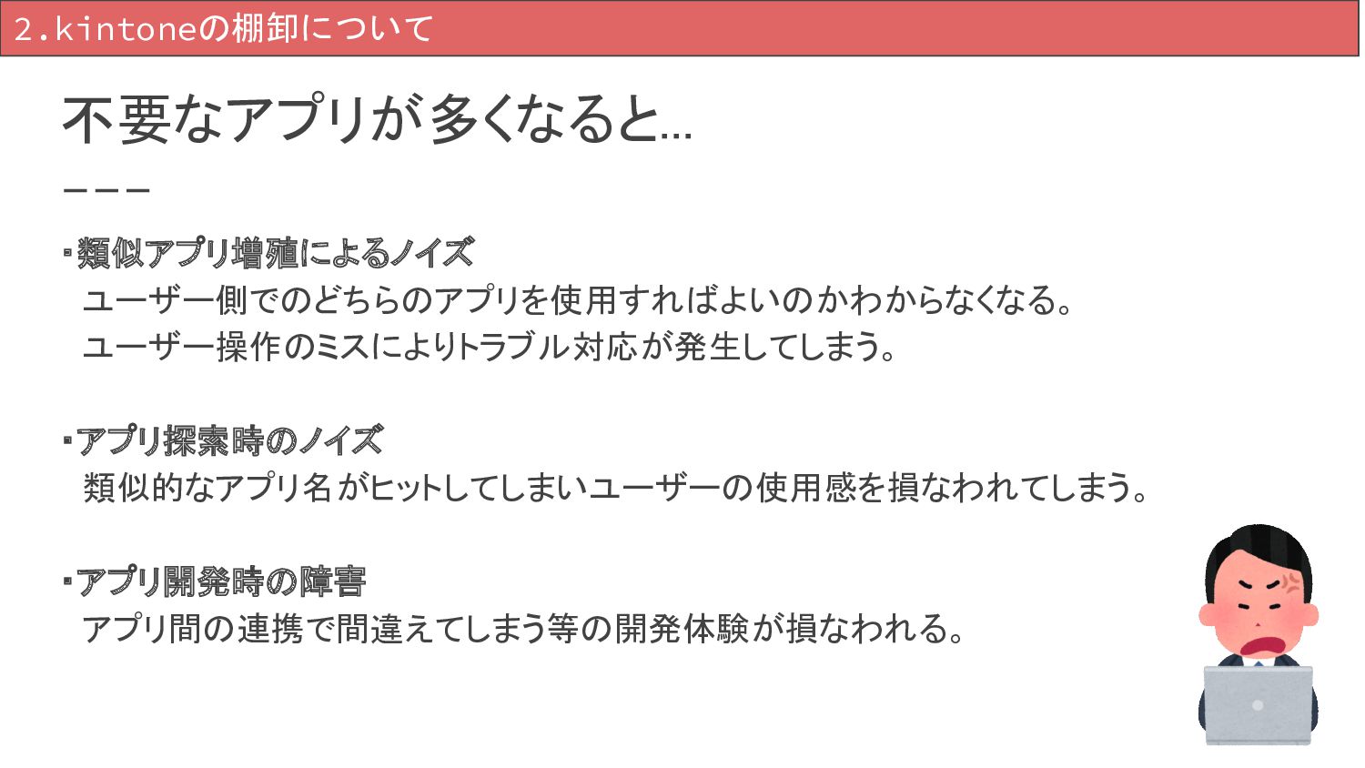 ・アプリ開発時の障害 アプリ間の連携で間違えてしまう等の開発体験が損なわれる。 2.kintoneの棚卸について