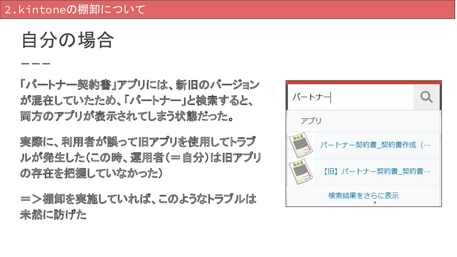自分の場合 2.kintoneの棚卸について 「パートナー契約書」アプリには、新旧のバージョン が混在していたため、「パートナー」と検索すると、 両方のアプリが表示されてしまう状態だった。 実際に、利用者が誤って旧アプリを使用してトラブ ルが発生した(この時、運用者(=自分)は旧アプリ の存在を把握していなかった)