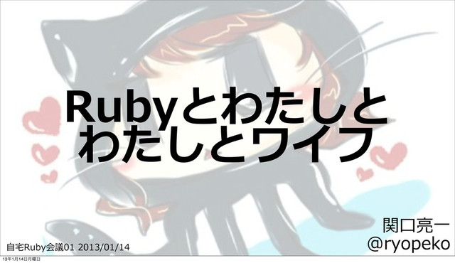 Rubyとわたしと わたしとワイフ ⾃自宅宅Ruby会議01 2013/01/14 関⼝口亮亮⼀一 @ryopeko 131݄14݄༵