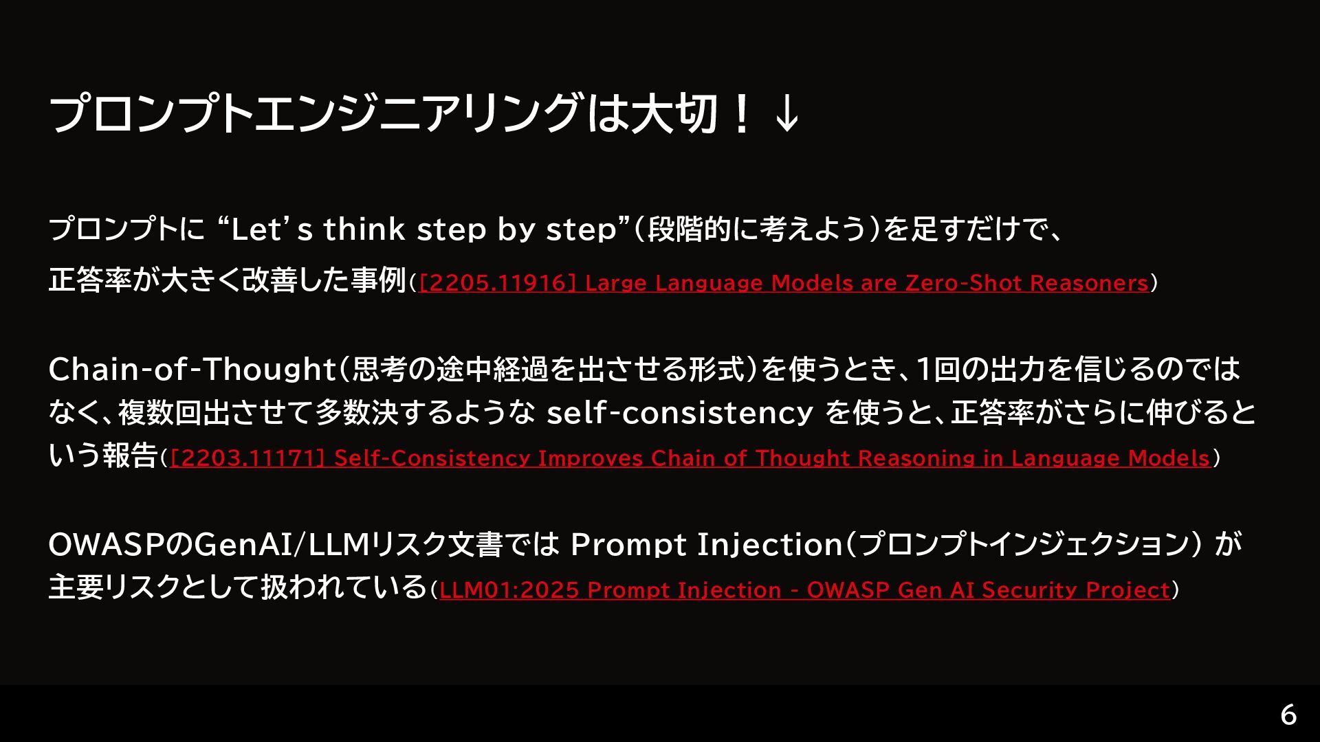 正答率が大きく改善した事例([2205.11916] Large Language Models are Zero-Shot Reasoners) Chain-of-Thought(思考の途中経過を出させる形式)を使うとき、1回の出力を信じるのでは なく、複数回出させて多数決するような self-consistency を使うと、正答率がさらに伸びると いう報告([2203.11171] Self-Consistency Improves Chain of Thought Reasoning in Language Models) OWASPのGenAI/LLMリスク文書では Prompt Injection(プロンプトインジェクション) が 主要リスクとして扱われている(LLM01:2025 Prompt Injection - OWASP Gen AI Security Project) 6