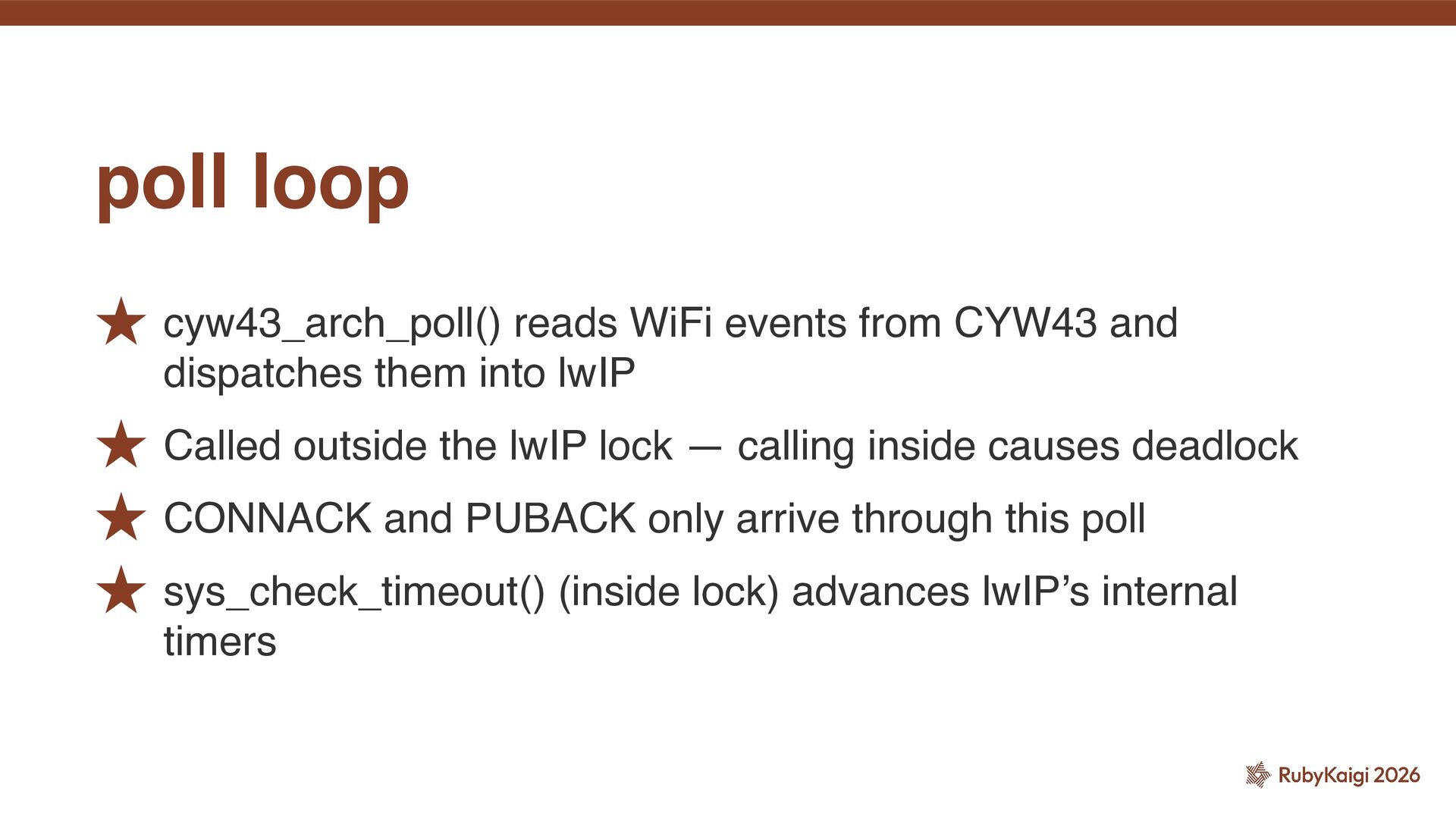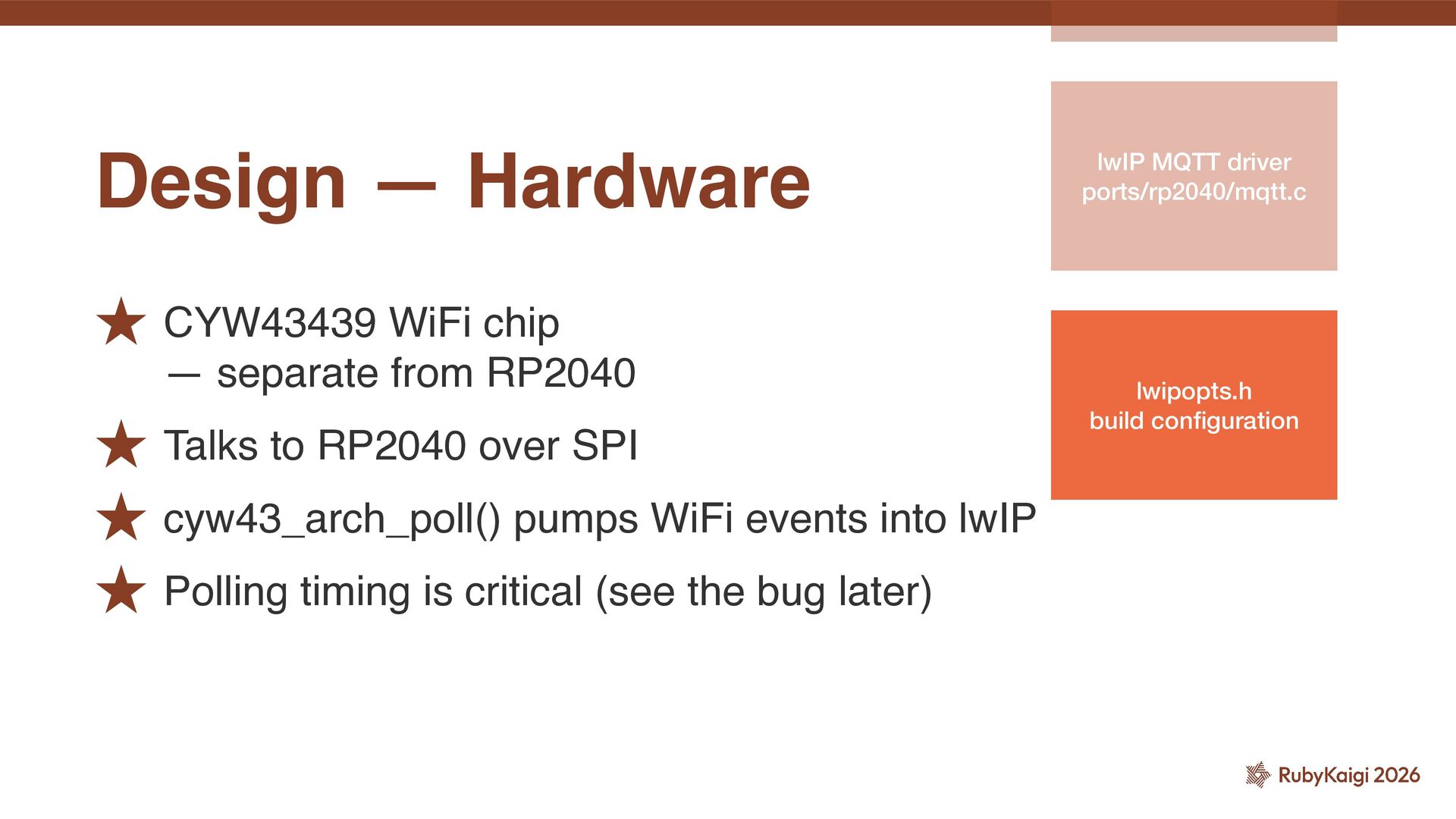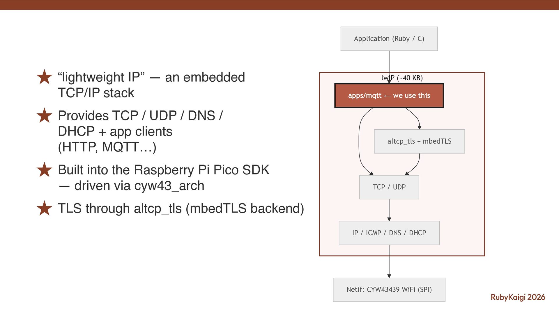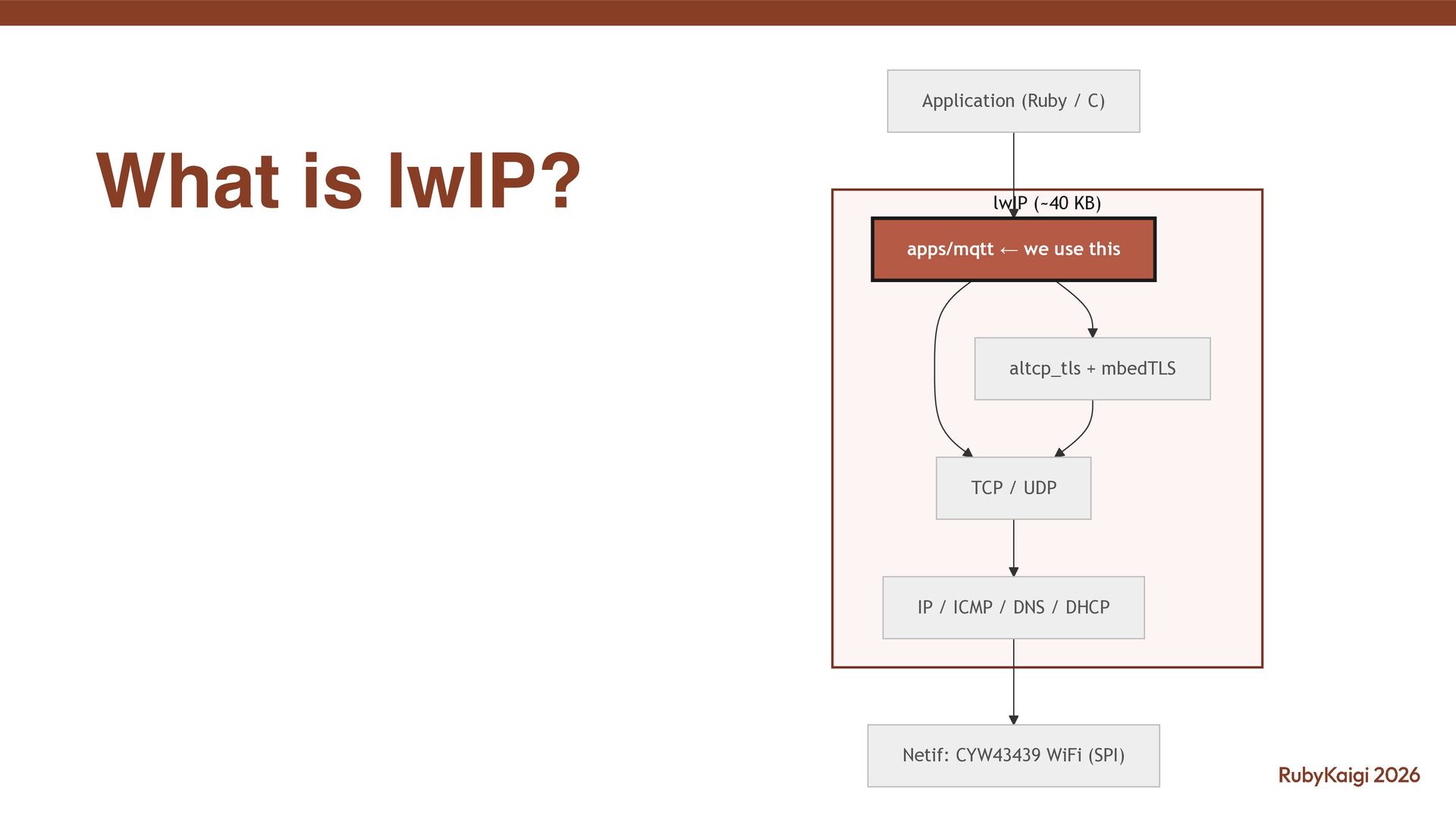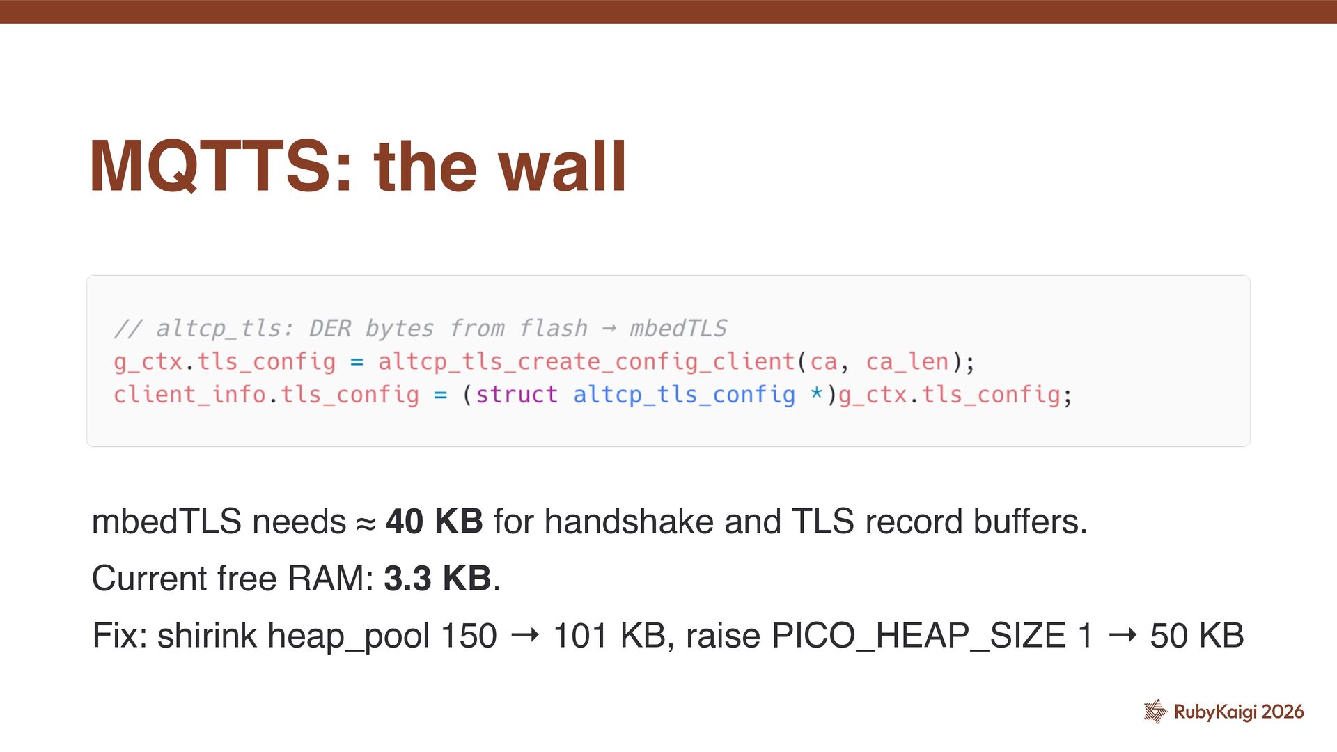 I spoke about the challenges of implementing MQTT and MQTTS (MQTT + TLS) based on picoruby-socket on an RP2040 board.