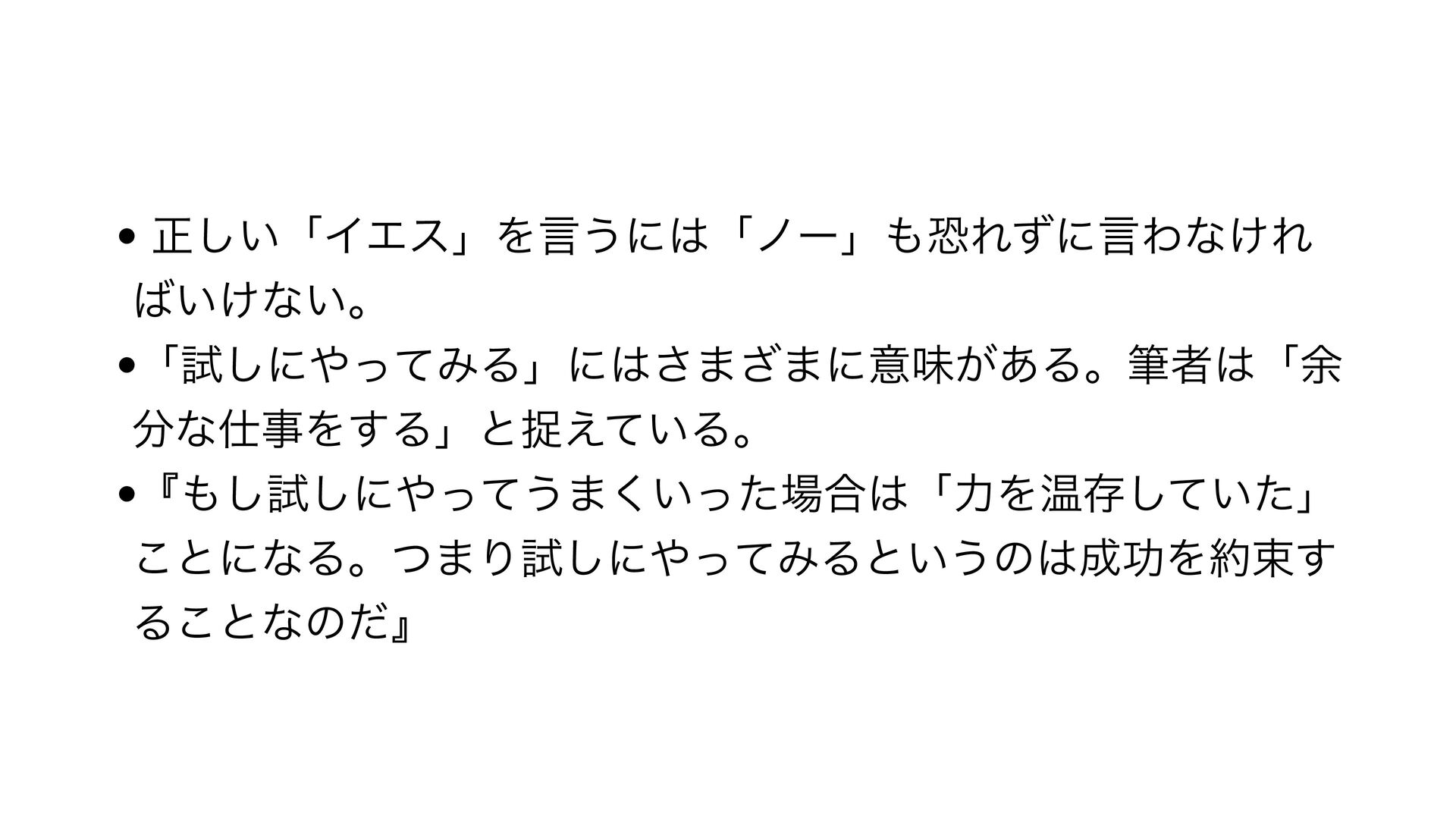 •ਖ਼͍͠ʮΠΤεʯΛݴ͏ʹʮϊʔʯڪΕͣʹݴΘͳ͚Ε ͍͚ͳ͍ɻ •ʮࢼ͠ʹͬͯΈΔʯʹ͞·͟·ʹҙຯ͕͋Δɻචऀʮ༨ ͳࣄΛ͢Δʯͱଊ͍͑ͯΔɻ •ʰ͠ࢼ͠ʹͬͯ͏·͍ͬͨ͘߹ʮྗΛԹଘ͍ͯͨ͠ʯ ͜ͱʹͳΔɻͭ·Γࢼ͠ʹͬͯΈΔͱ͍͏ͷޭΛଋ͢ Δ͜ͱͳͷͩʱ