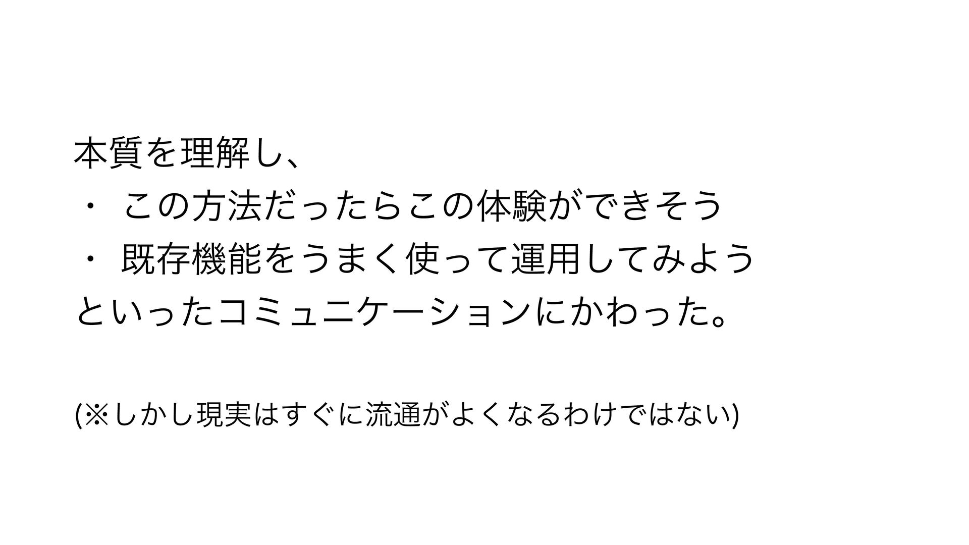 ຊ࣭Λཧղ͠ɺ ɾ͜ͷํ๏ͩͬͨΒ͜ͷମݧ͕Ͱ͖ͦ͏ ɾطଘػೳΛ͏·ͬͯ͘ӡ༻ͯ͠ΈΑ͏ ͱ͍ͬͨίϛϡχέʔγϣϯʹ͔Θͬͨɻ ˞͔͠͠ݱ࣮͙͢ʹྲྀ௨͕Α͘ͳΔΘ͚Ͱͳ͍