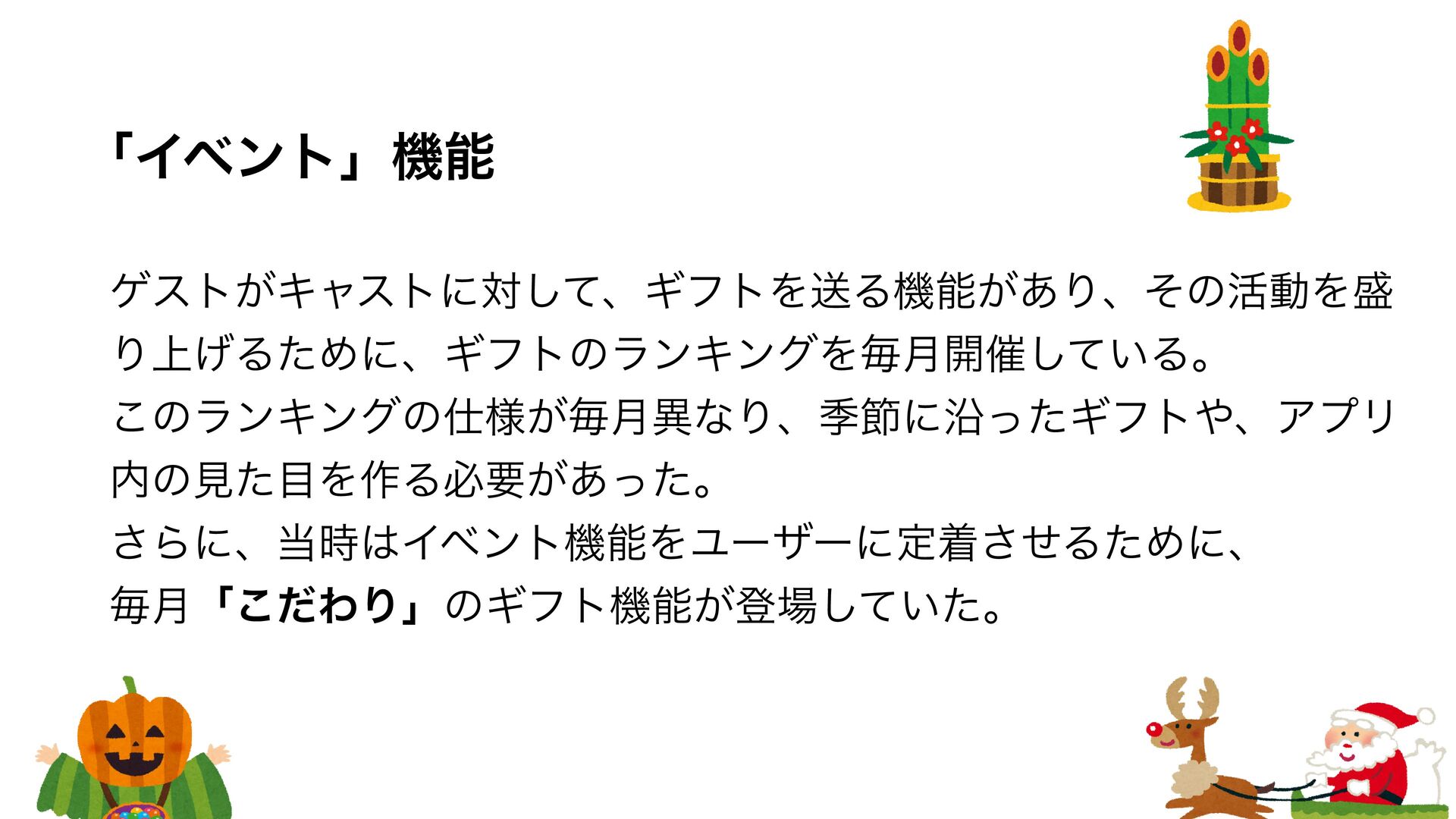 ήετ͕Ωϟετʹରͯ͠ɺΪϑτΛૹΔػೳ͕͋Γɺͦͷ׆ಈΛ Γ্͛ΔͨΊʹɺΪϑτͷϥϯΩϯάΛຖ݄։࠵͍ͯ͠Δɻ ͜ͷϥϯΩϯάͷ༷͕ຖ݄ҟͳΓɺقઅʹԊͬͨΪϑτɺΞϓϦ ͷݟͨΛ࡞Δඞཁ͕͋ͬͨɻ ͞Βʹɺ࣌ΠϕϯτػೳΛϢʔβʔʹఆணͤ͞ΔͨΊʹɺ ຖ݄ʮͩ͜ΘΓʯͷΪϑτػೳ͕ొ͍ͯͨ͠ɻ ʮΠϕϯτʯػೳ