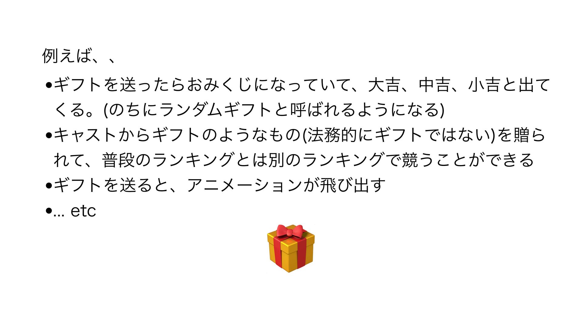 ྫ͑ɺɺ •ΪϑτΛૹͬͨΒ͓Έ͘͡ʹͳ͍ͬͯͯɺେ٢ɺத٢ɺখ٢ͱग़ͯ ͘Δɻ ͷͪʹϥϯμϜΪϑτͱݺΕΔΑ͏ʹͳΔ •Ωϟετ͔ΒΪϑτͷΑ͏ͳͷ ๏తʹΪϑτͰͳ͍ ΛଃΒ ΕͯɺීஈͷϥϯΩϯάͱผͷϥϯΩϯάͰڝ͏͜ͱ͕Ͱ͖Δ •ΪϑτΛૹΔͱɺΞχϝʔγϣϯ͕ඈͼग़͢