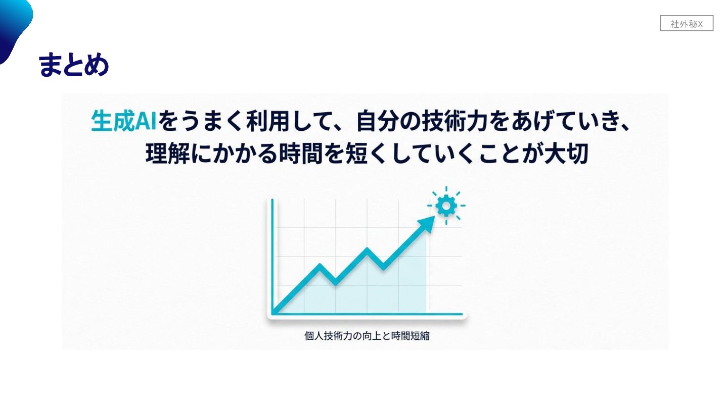 自分が担当したタスクに関して、質問がきたら自分が答えられるように準備をしておく必要がある 理由 今は、まだの理由 - 今後生成AIがさらに成長し、リファクタ必要なくなる、AIが解決できない問題がなくなる →人間が責任を持たなくてもいいのかもしれない 自分がコードを理解する必要性 - トラブルシューティングの対応が遅れる - なぜこの設計にしたのか意図がないと、誰も手がつけれないブラックボックスになる