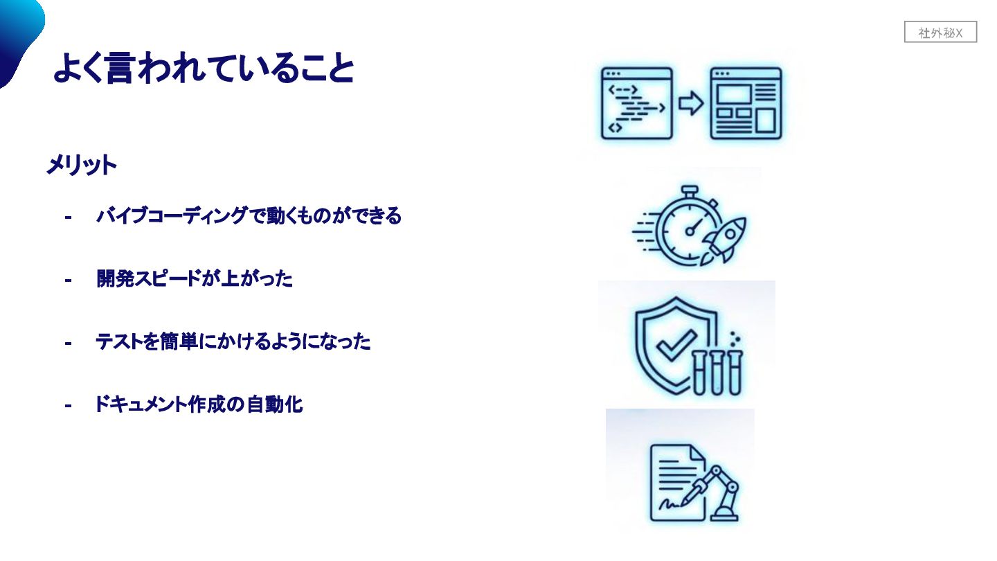 - バイブコーディングで動くものができる - 開発スピードが上がった - テストを簡単にかけるようになった - ドキュメント作成の自動化
