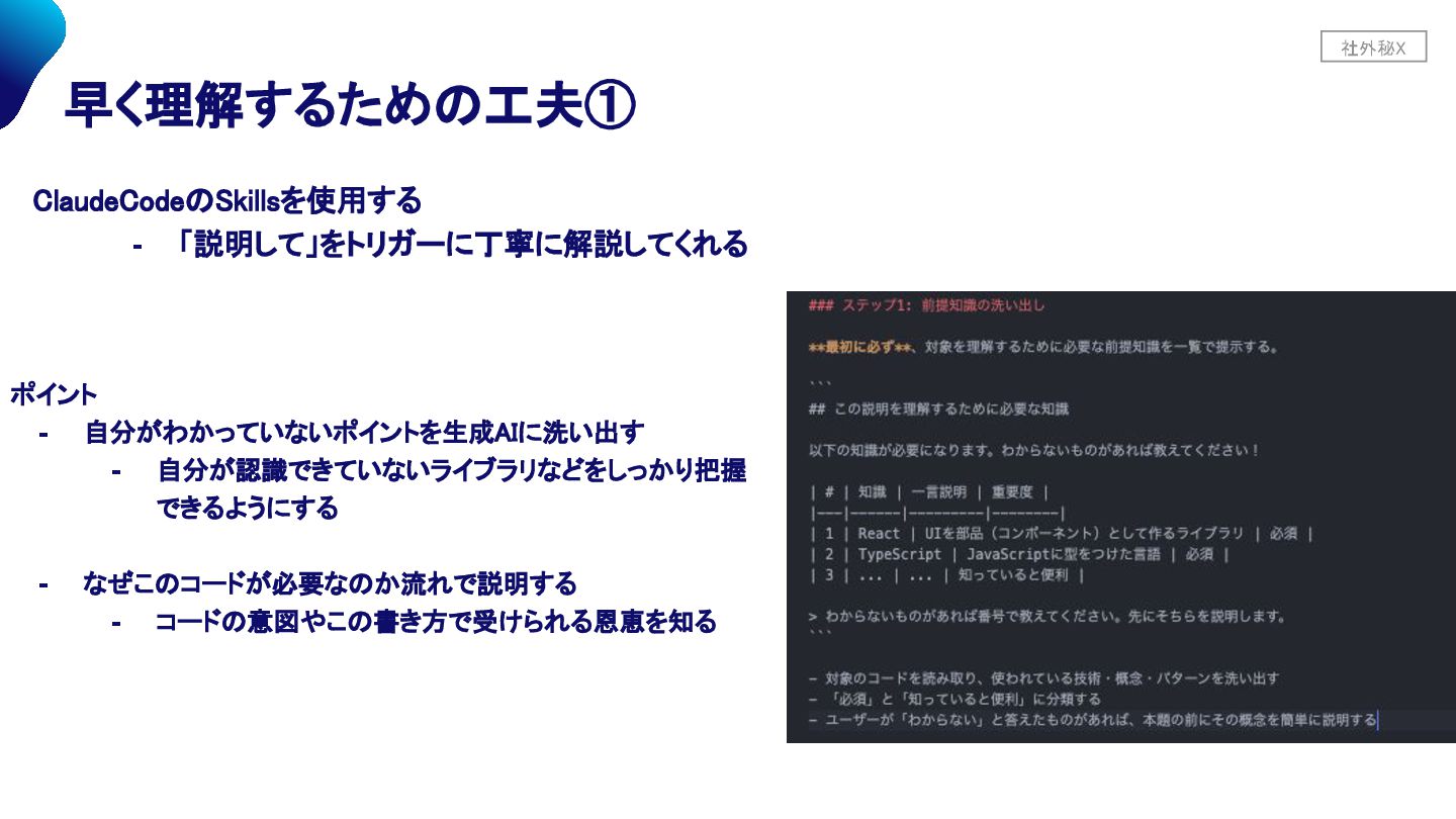 社外秘X 9 KDDI Agile Development Center Corporation 早く理解するための工夫① ClaudeCodeのSkillsを使用する