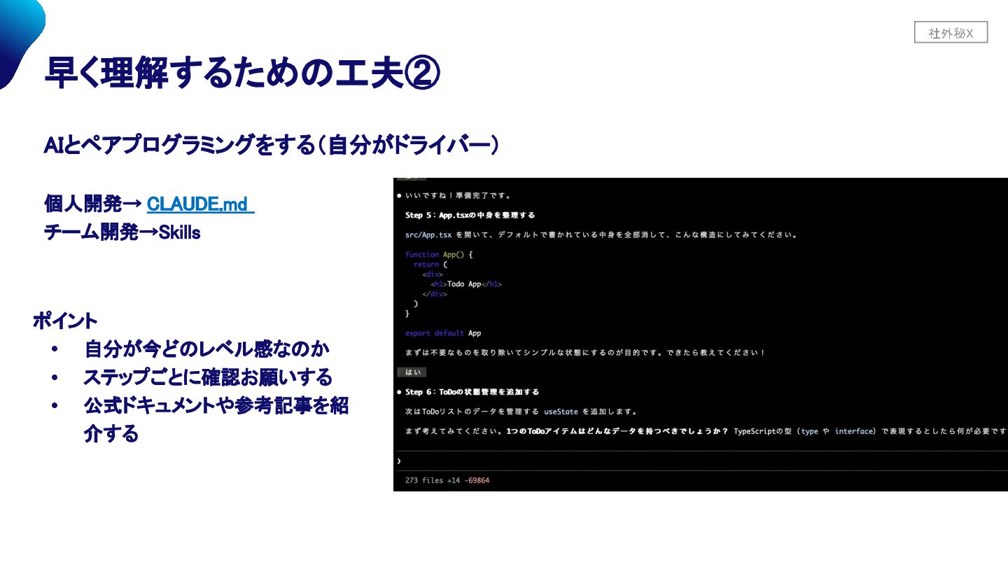 社外秘X 10 KDDI Agile Development Center Corporation AIとペアプログラミングをする(自分がドライバー) 早く理解するための工夫②