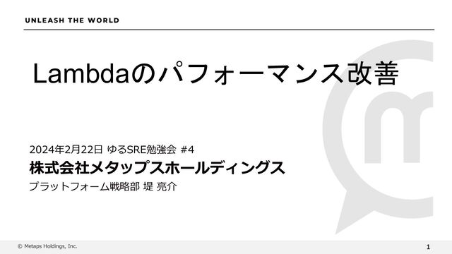 1 Lambdaのパフォーマンス改善 プラットフォーム戦略部 堤 亮介 株式会社メタップスホールディングス 2024年2⽉22⽇ ゆるSRE勉強会 #4 ©