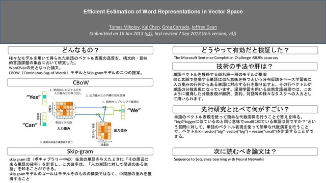 2014の英語からドイツ語への翻訳タスク:28.4 BLEUを達成、アンサンブ ルを含む既存の最良の結果を2 BLEU以上改善した。 Transformerは基本的な大枠はエンコーダ-デコーダモデルでself-attention層と Position-wise全結合層を使用している。 Self-Attentionを用いている。 文中のある単語の意味を理解する時に、文中の単語のどれに注目すれば良い かを表すスコアのこと AttentionとはQuery Q とKey K とValue V の3つのベクトルで計算される。各単語がそれぞ れのQueryとKeyとValueのベクトルを持っている。 QueryとKeyでAttentionスコアを計算し、そのAttentionスコアを使ってValueを 加重和すると、Attentionを適用した単語の潜在表現が手に入る。 短時間の訓練で高いBLEUスコアを達成した。 翻訳タスクにおいて、Seq2seq(RNNベースEncoder-Decoderモデル)よりも早くて 精度が高い。 並列化がかなりしやすく訓練時間が圧倒的に削減できる。 Transformerは他のタスクにも汎用性が高い。 RNNとエンコーダ-デコーダモデルの訓練時に並列処理ができないという大き な欠点を指摘し、RNN や CNN を使わず Attention のみ使用したニューラル機械 翻訳 Transformer を提案している. Attention Is All You Need Ashish Vaswani, Noam Shazeer, Niki Parmar, Jakob Uszkoreit, Llion Jones, Aidan N. Gomez, Lukasz Kaiser, Illia Polosukhin (Submitted on 12 Jun 2017 (v1), last revised 6 Dec 2017 (this version, v5)) どんなもの? 先行研究と比べて何がすごい? 技術の手法や肝は? どうやって有効だと検証した? 次に読むべき論文は?