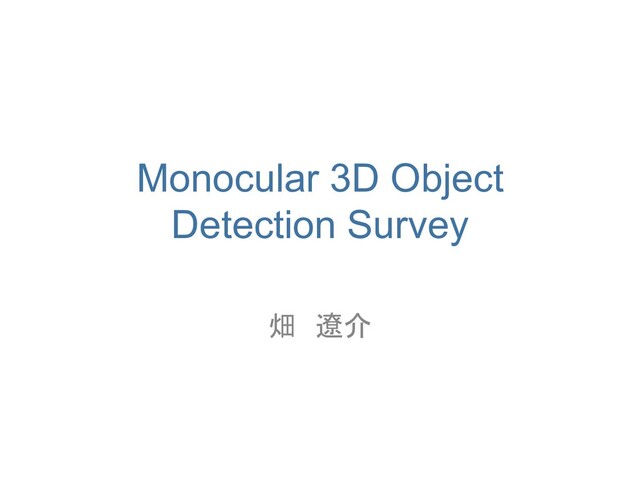 Key Point 特徴 ・SSDの特徴量から2次元擬推定,3次元Bounding Box, WireFrameに よる推定によるJointで最終的にrobostな3次元位置推定。(別の車に 隠れている車があるので,より頑健にしたい) ・Loss function周りや,3次元推定の数式の説明が丁寧。