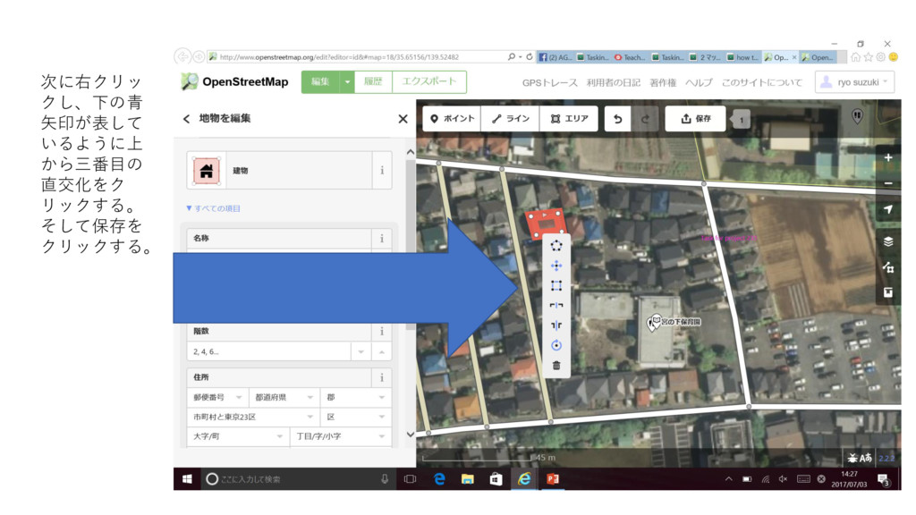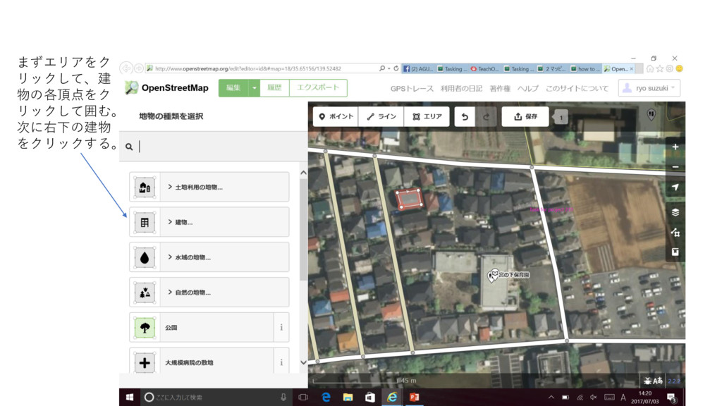 まずエリアをク リックして、建 物の各頂点をク リックして囲む。 次に右下の建物 をクリックする。