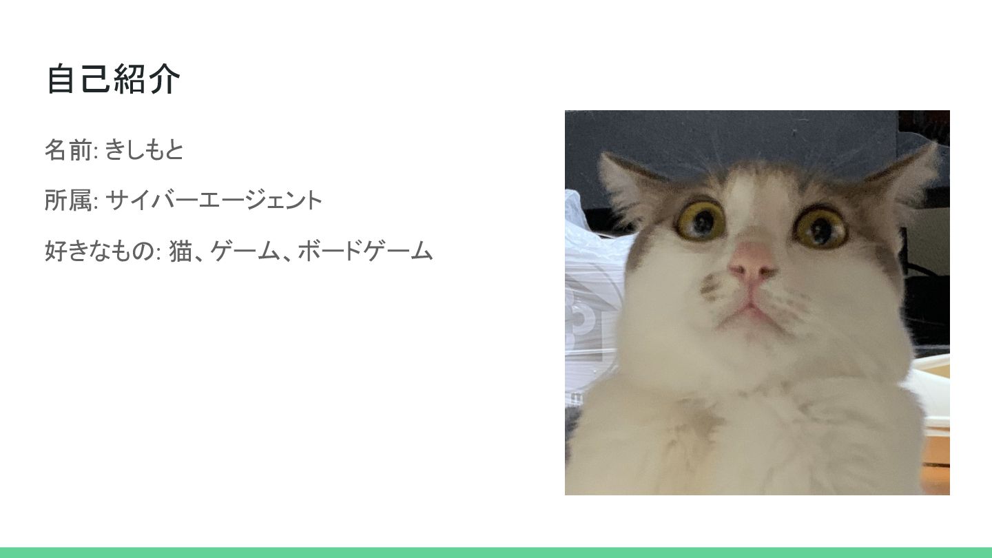 自己紹介 名前: きしもと 所属: サイバーエージェント 好きなもの: 猫、ゲーム、ボードゲーム