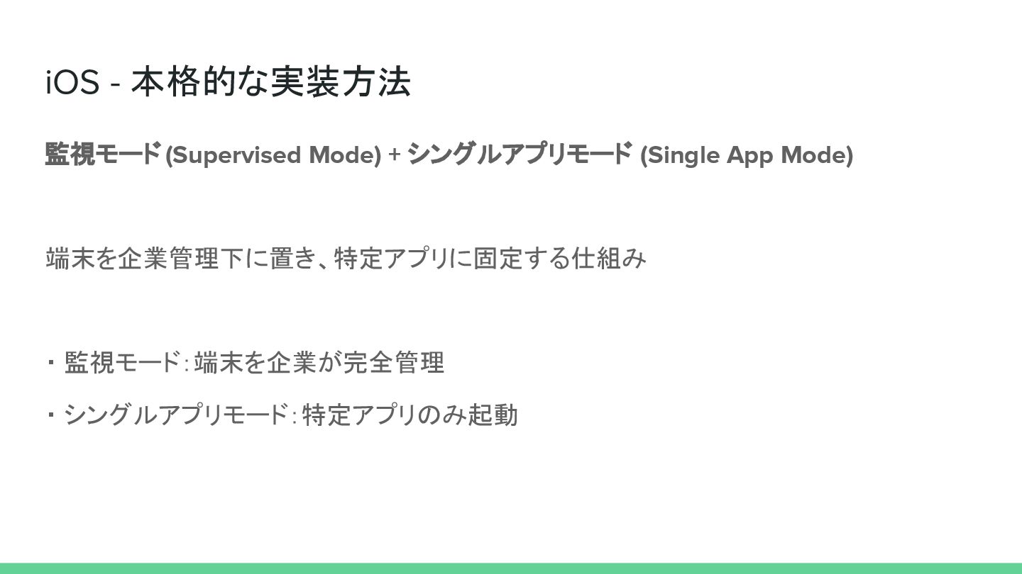Mode) 端末を企業管理下に置き、特定アプリに固定する仕組み ・ 監視モード:端末を企業が完全管理 ・ シングルアプリモード:特定アプリのみ起動