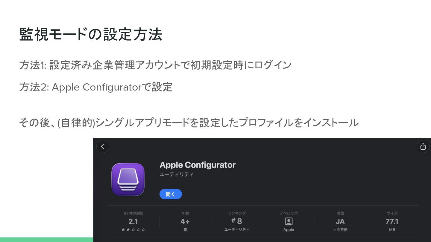 監視モードの設定方法 方法1: 設定済み企業管理アカウントで初期設定時にログイン 方法2: Apple Configuratorで設定 その後、(自律的)シングルアプリモードを設定したプロファイルをインストール