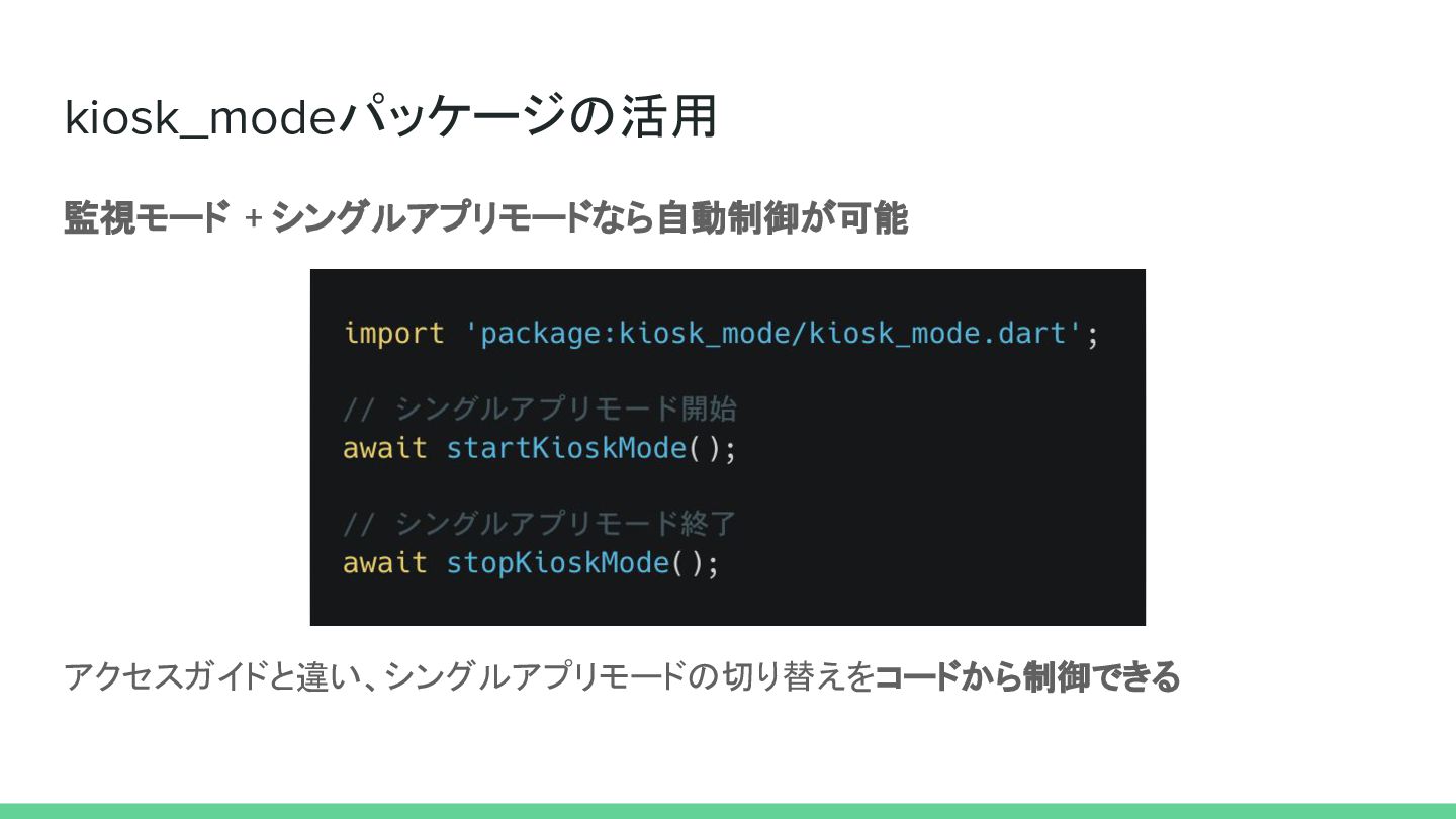 kiosk_modeパッケージの活用 監視モード + シングルアプリモードなら自動制御が可能 アクセスガイドと違い、シングルアプリモードの切り替えをコードから制御できる