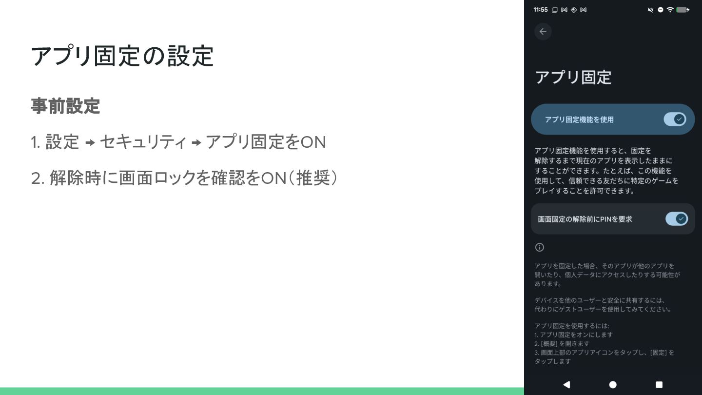 アプリ固定の設定 事前設定 1. 設定 → セキュリティ → アプリ固定をON 2. 解除時に画面ロックを確認をON(推奨)