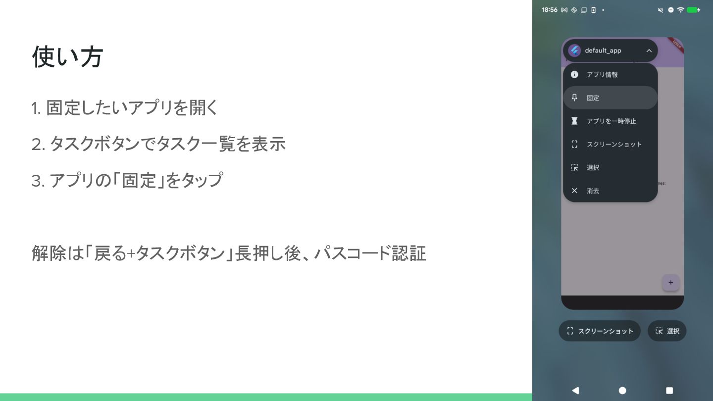 使い方 1. 固定したいアプリを開く 2. タスクボタンでタスク一覧を表示 3. アプリの「固定」をタップ 解除は「戻る+タスクボタン」長押し後、パスコード認証
