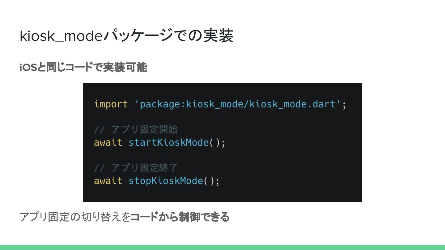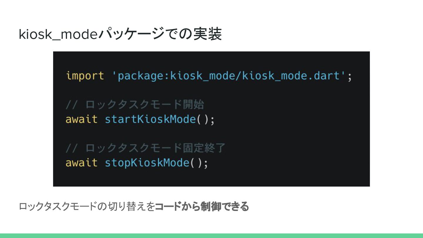 kiosk_modeパッケージでの実装 iOSと同じコードで実装可能 アプリ固定の切り替えをコードから制御できる