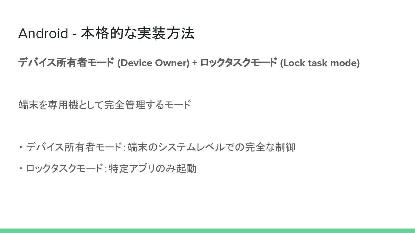 mode) 端末を専用機として完全管理するモード ・ デバイス所有者モード:端末のシステムレベルでの完全な制御 ・ ロックタスクモード:特定アプリのみ起動