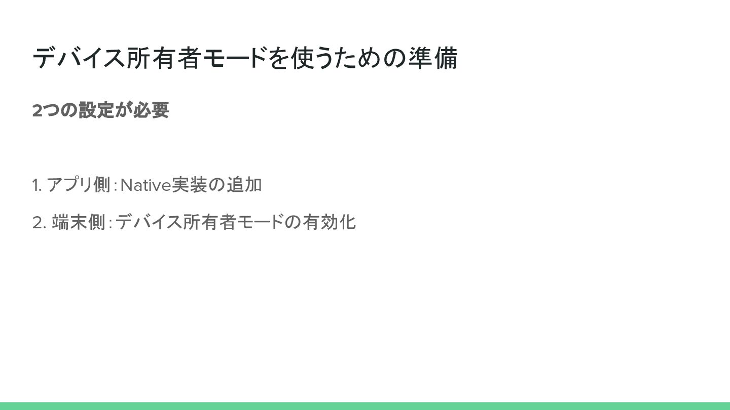 デバイス所有者モードを使うための準備 2つの設定が必要 1. アプリ側:Native実装の追加 2. 端末側:デバイス所有者モードの有効化