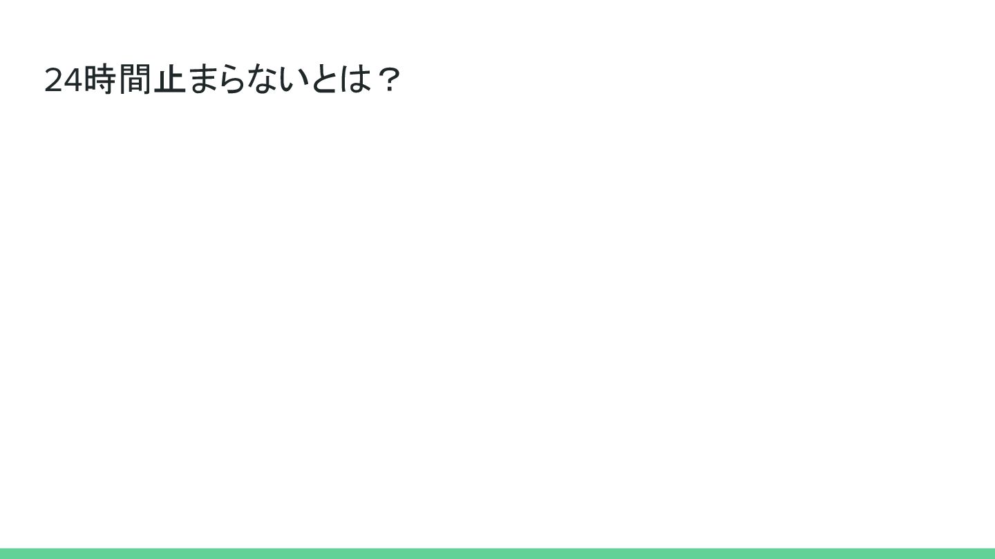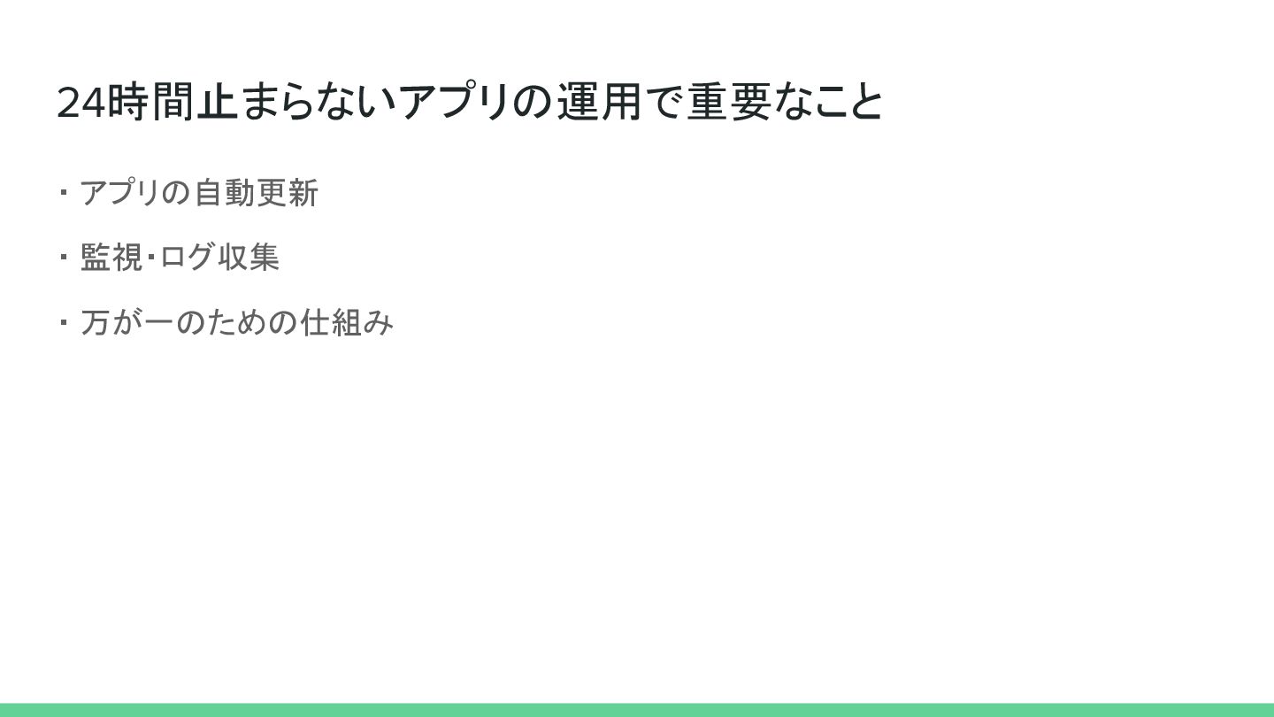 24時間止まらないアプリの運用で重要なこと ・ アプリの自動更新 ・ 監視・ログ収集 ・ 万が一のための仕組み