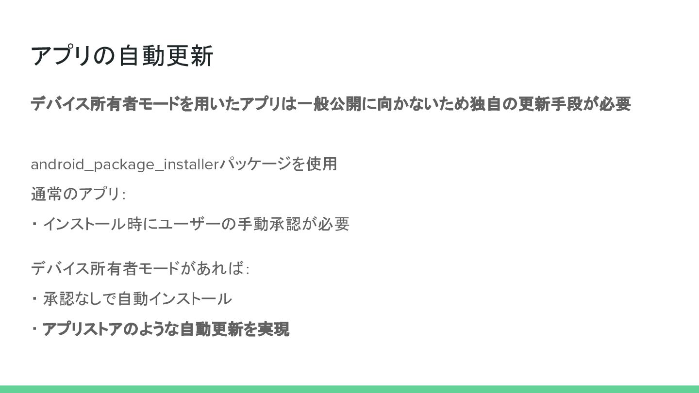 アプリの自動更新 デバイス所有者モードを用いたアプリは一般公開に向かないため独自の更新手段が必要 android_package_installerパッケージを使用 通常のアプリ: ・ インストール時にユーザーの手動承認が必要 デバイス所有者モードがあれば: ・ 承認なしで自動インストール ・