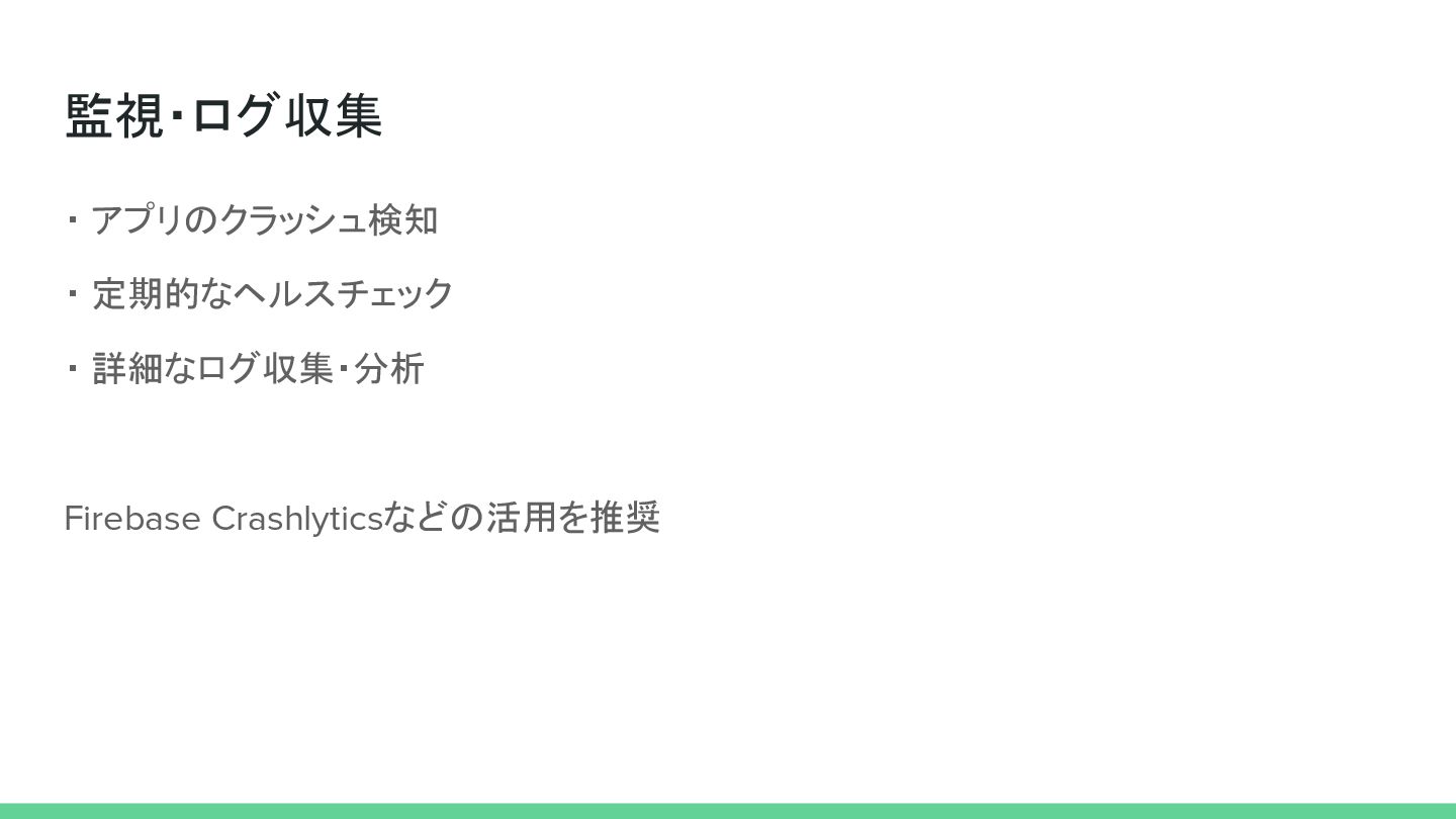 監視・ログ収集 ・ アプリのクラッシュ検知 ・ 定期的なヘルスチェック ・ 詳細なログ収集・分析 Firebase Crashlyticsなどの活用を推奨