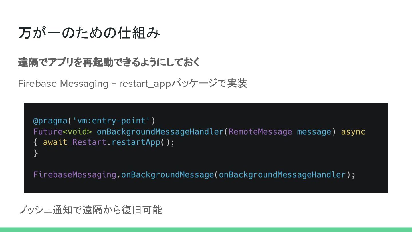 万が一のための仕組み 遠隔でアプリを再起動できるようにしておく Firebase Messaging + restart_appパッケージで実装 プッシュ通知で遠隔から復旧可能