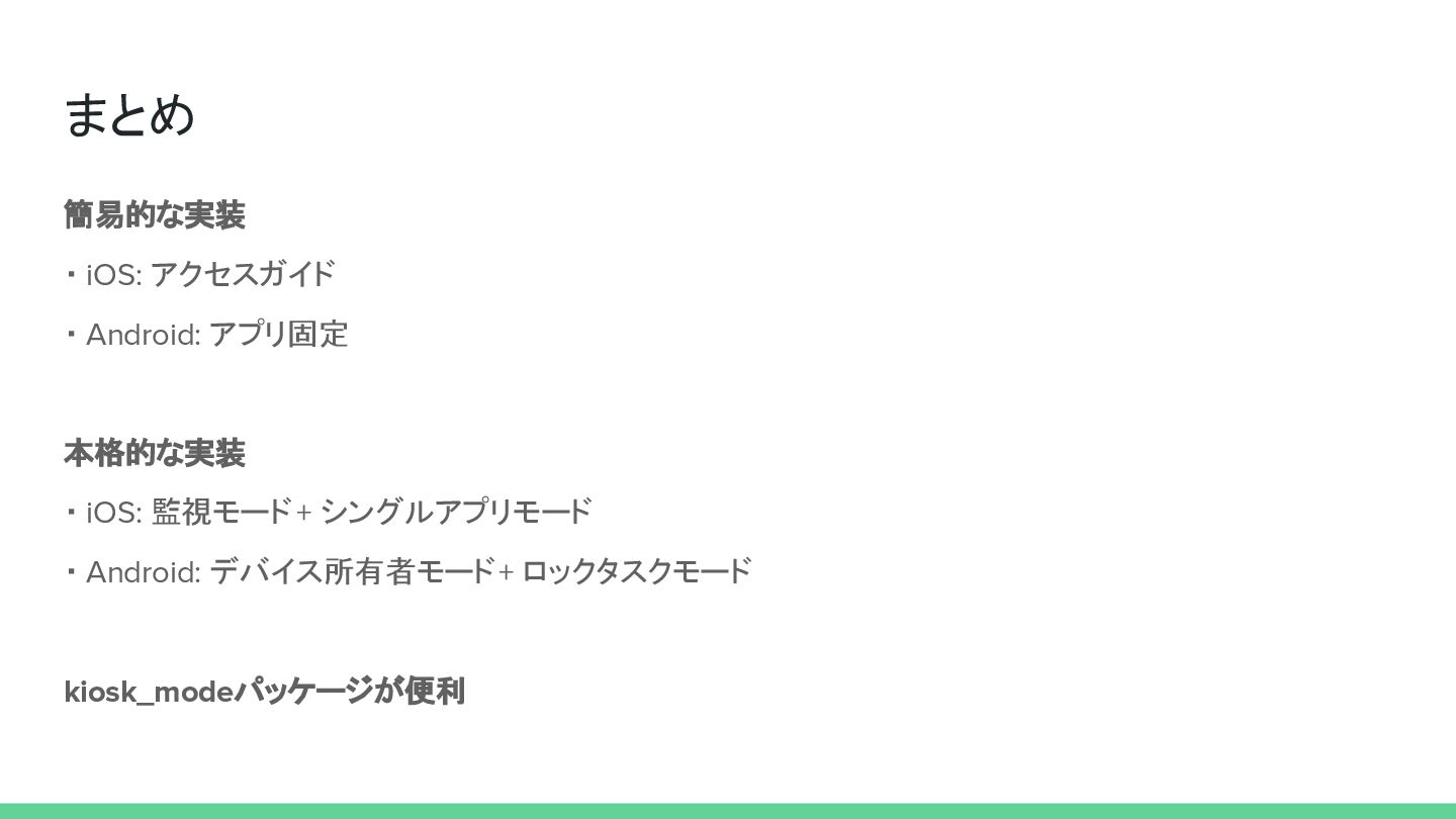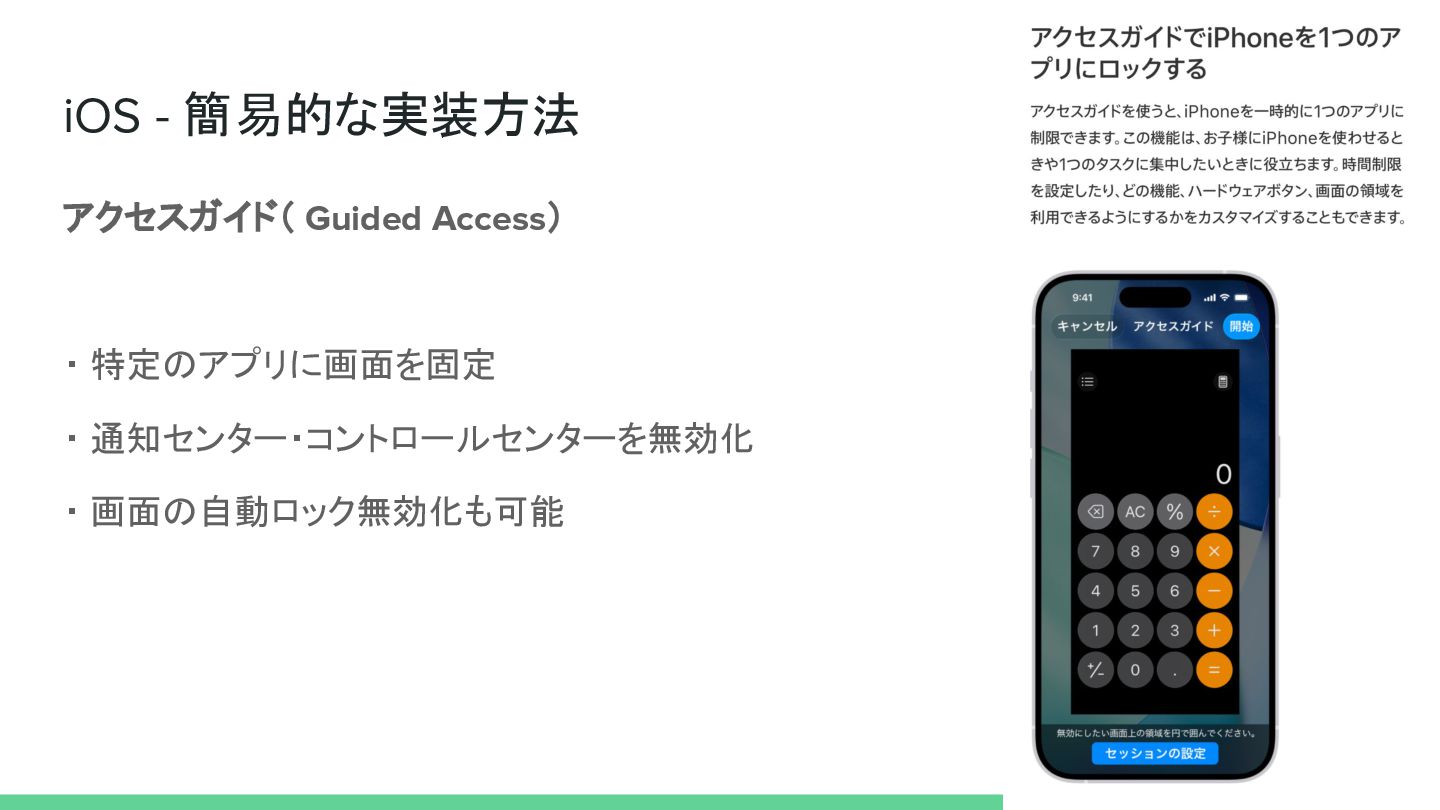 まとめ 簡易的な実装 ・ iOS: アクセスガイド ・ Android: アプリ固定 本格的な実装 ・