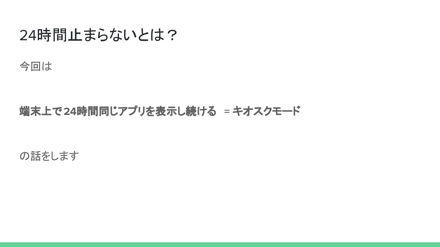 24時間止まらないとは? 今回は 端末上で24時間同じアプリを表示し続ける = キオスクモード の話をします
