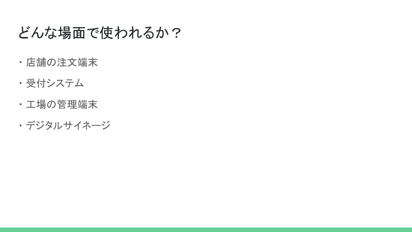 どんな場面で使われるか? ・ 店舗の注文端末 ・ 受付システム ・ 工場の管理端末 ・ デジタルサイネージ