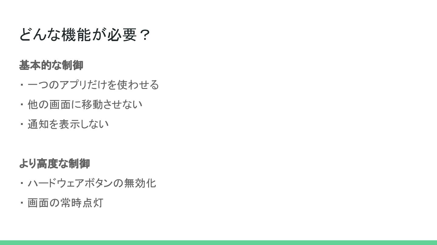 どんな機能が必要? 基本的な制御 ・ 一つのアプリだけを使わせる ・ 他の画面に移動させない ・ 通知を表示しない より高度な制御 ・