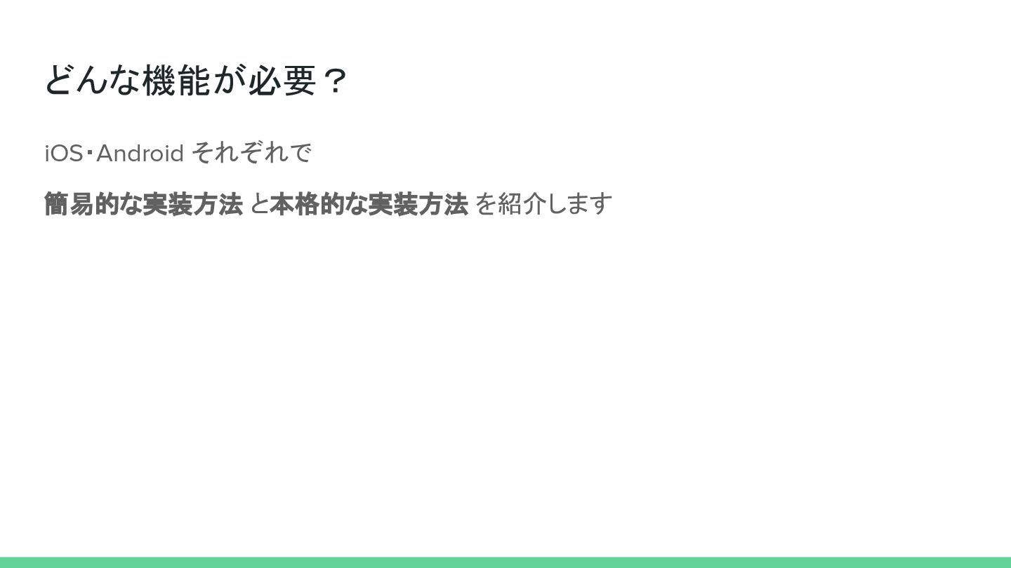 どんな機能が必要? iOS・Android それぞれで 簡易的な実装方法 と本格的な実装方法 を紹介します