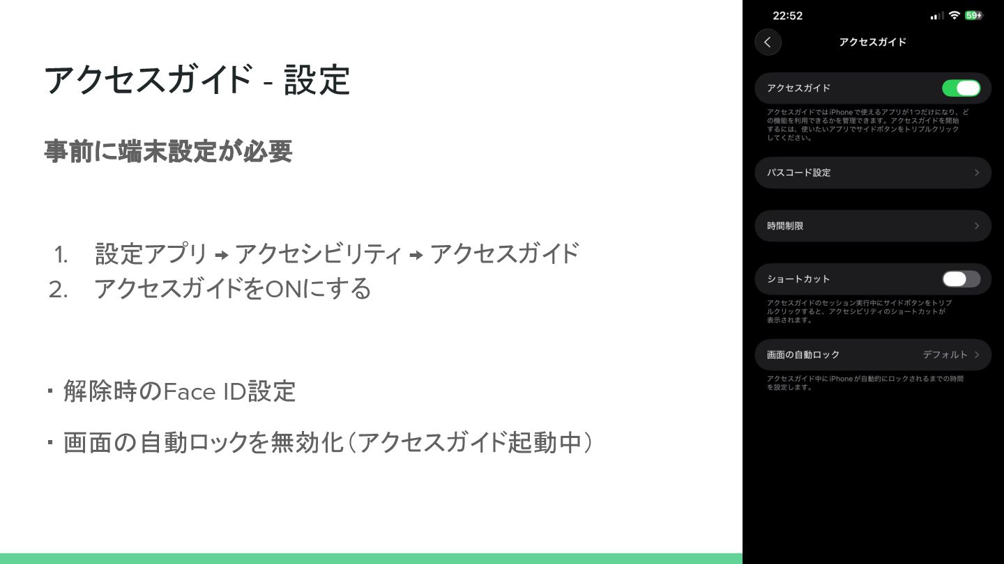 2. アクセスガイドをONにする ・ 解除時のFace ID設定 ・ 画面の自動ロックを無効化(アクセスガイド起動中)