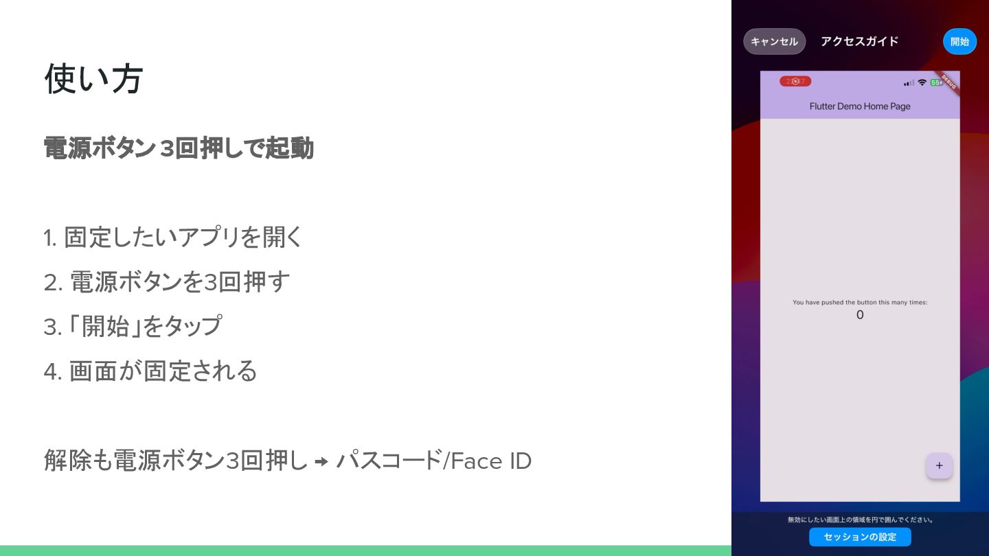 使い方 電源ボタン 3回押しで起動 1. 固定したいアプリを開く 2. 電源ボタンを3回押す 3. 「開始」をタップ 4.