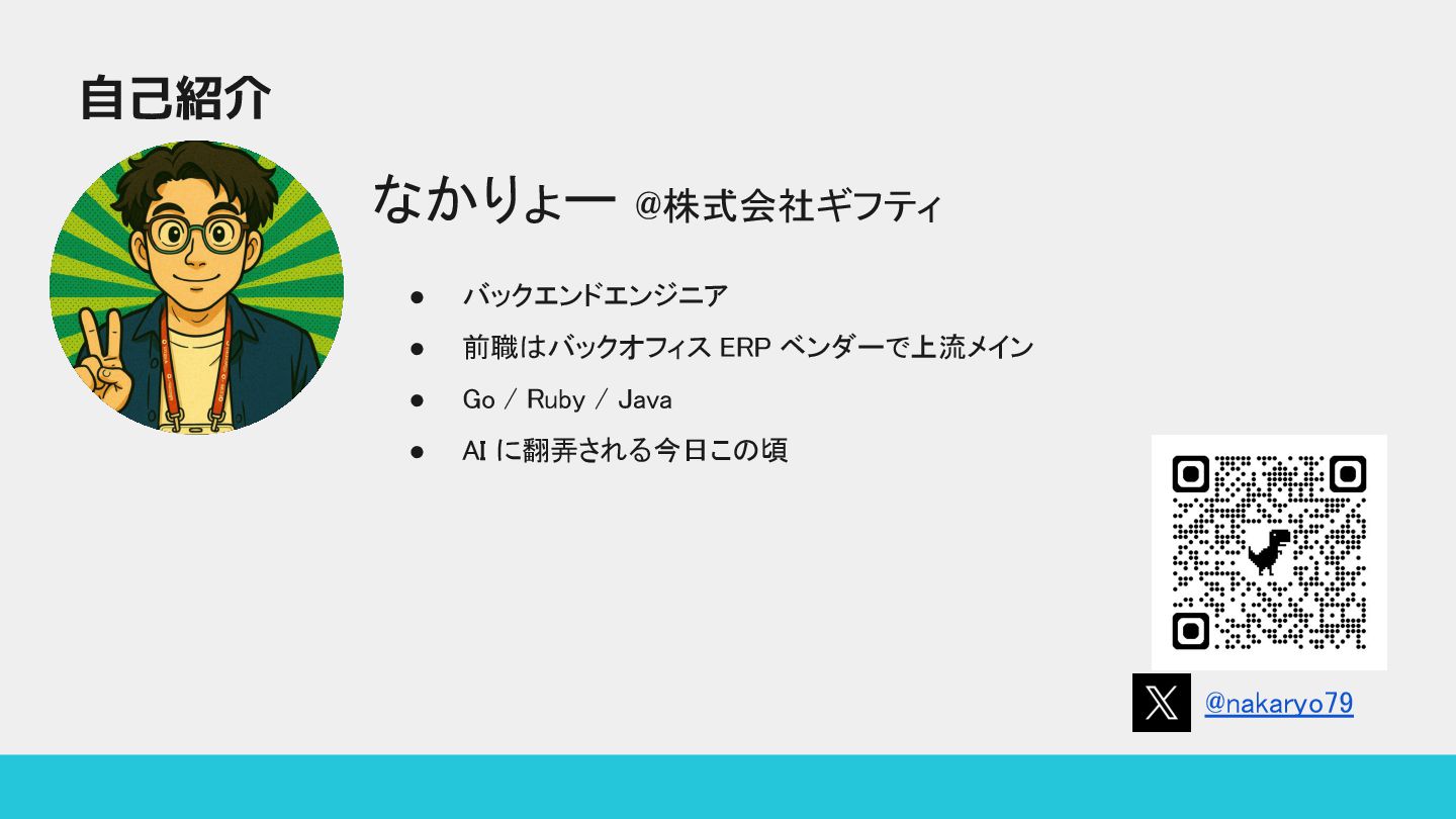 ERP ベンダーで上流メイン • Go / Ruby / Java • AI に翻弄される今日この頃 @nakaryo79