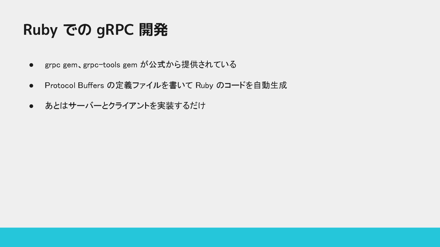 • grpc gem、grpc-tools gem が公式から提供されている • Protocol Buffers の定義ファイルを書いて