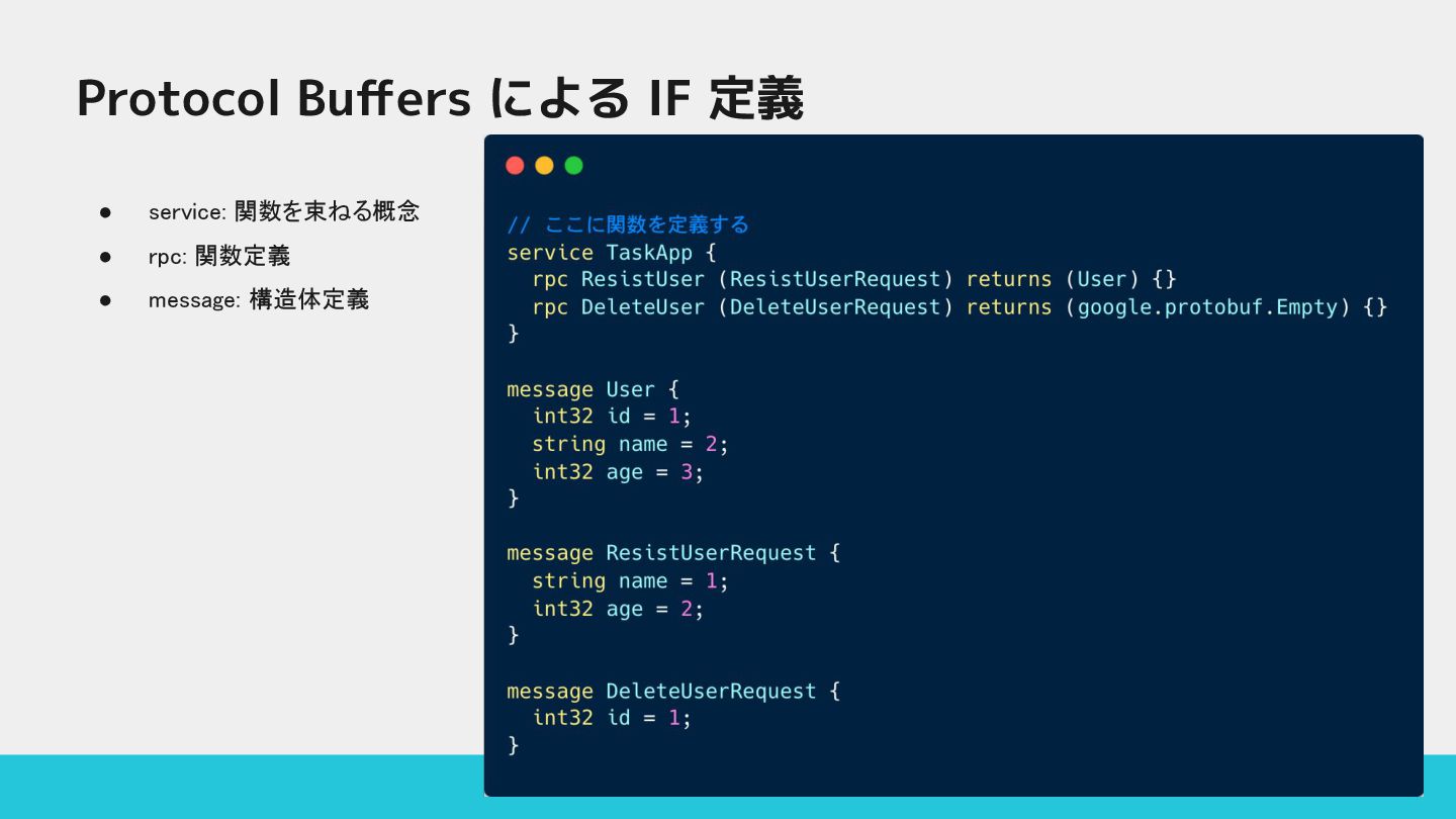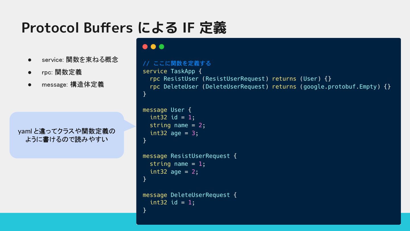 • service: 関数を束ねる概念 • rpc: 関数定義 • message: 構造体定義 Protocol