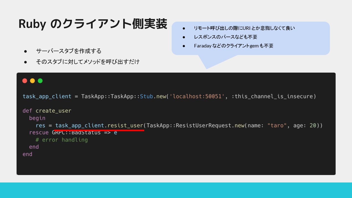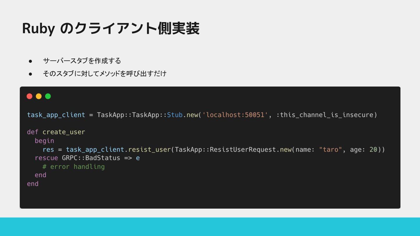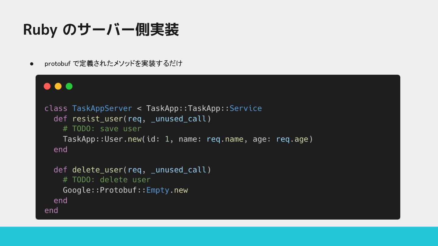 • protobuf で定義されたメソッドを実装するだけ Ruby のサーバー側実装