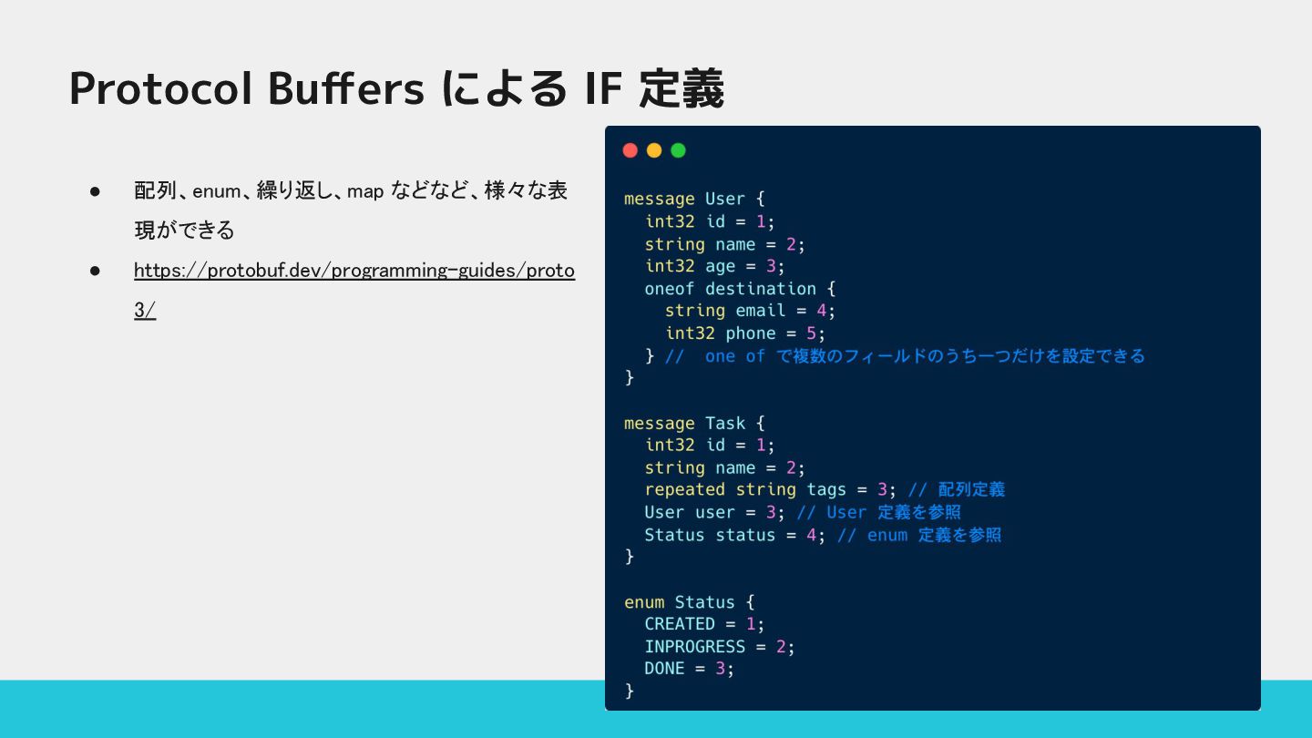 • 配列、enum、繰り返し、map などなど、様々な表 現ができる • https://protobuf.dev/programming-guides/proto 3/ Protocol Buffers による