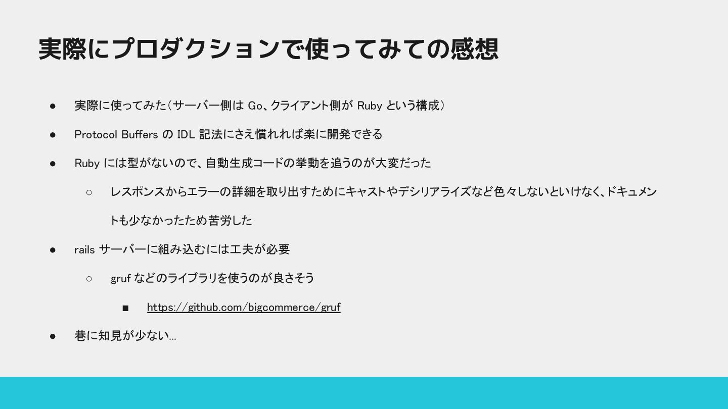 記法にさえ慣れれば楽に開発できる • Ruby には型がないので、自動生成コードの挙動を追うのが大変だった ◦ レスポンスからエラーの詳細を取り出すためにキャストやデシリアライズなど色々しないといけなく、ドキュメン トも少なかったため苦労した • rails サーバーに組み込むには工夫が必要 ◦ gruf などのライブラリを使うのが良さそう ▪ https://github.com/bigcommerce/gruf • 巷に知見が少ない... 実際にプロダクションで使ってみての感想