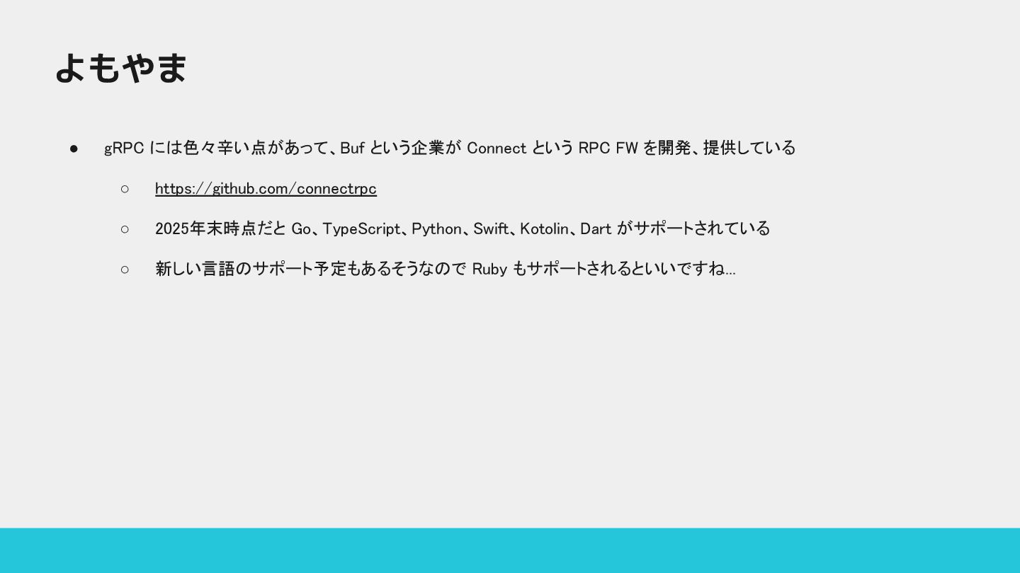 https://github.com/connectrpc ◦ 2025年末時点だと Go、TypeScript、Python、Swift、Kotolin、Dart がサポートされている ◦ 新しい言語のサポート予定もあるそうなので Ruby もサポートされるといいですね... よもやま