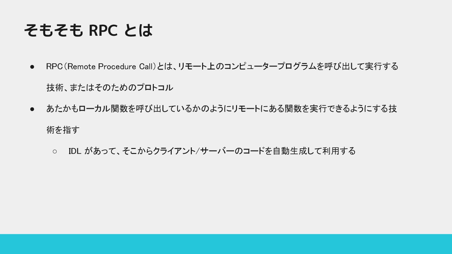 • RPC(Remote Procedure Call)とは、リモート上のコンピュータープログラムを呼び出して実行する 技術、またはそのためのプロトコル • あたかもローカル関数を呼び出しているかのようにリモートにある関数を実行できるようにする技 術を指す ◦