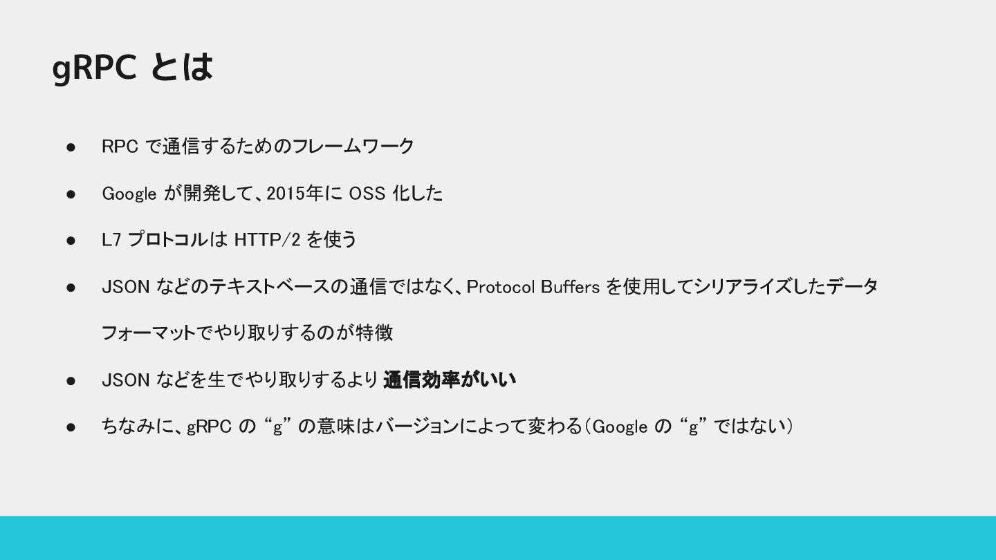 • L7 プロトコルは HTTP/2 を使う • JSON などのテキストベースの通信ではなく、Protocol Buffers を使用してシリアライズしたデータ フォーマットでやり取りするのが特徴 • JSON などを生でやり取りするより 通信効率がいい • ちなみに、gRPC の “g” の意味はバージョンによって変わる(Google の “g” ではない) gRPC とは