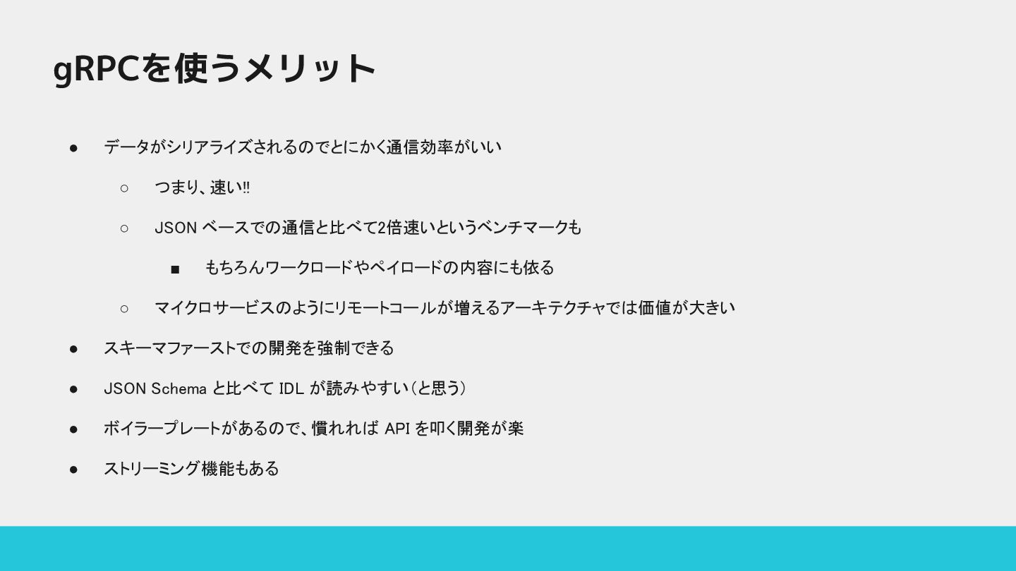 マイクロサービスのようにリモートコールが増えるアーキテクチャでは価値が大きい • スキーマファーストでの開発を強制できる • JSON Schema と比べて IDL が読みやすい(と思う) • ボイラープレートがあるので、慣れれば API を叩く開発が楽 • ストリーミング機能もある gRPCを使うメリット