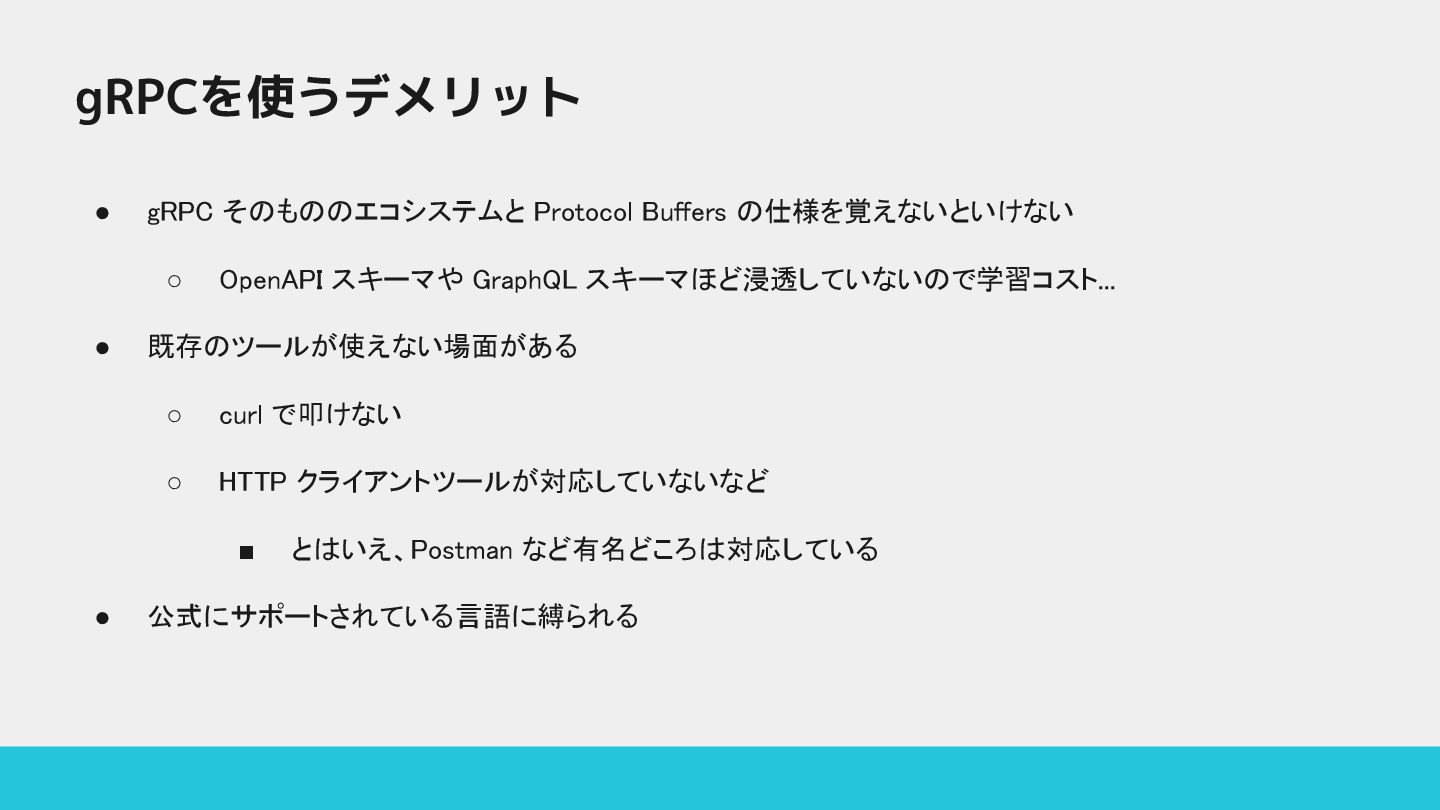 GraphQL スキーマほど浸透していないので学習コスト... • 既存のツールが使えない場面がある ◦ curl で叩けない ◦ HTTP クライアントツールが対応していないなど ▪ とはいえ、Postman など有名どころは対応している • 公式にサポートされている言語に縛られる gRPCを使うデメリット