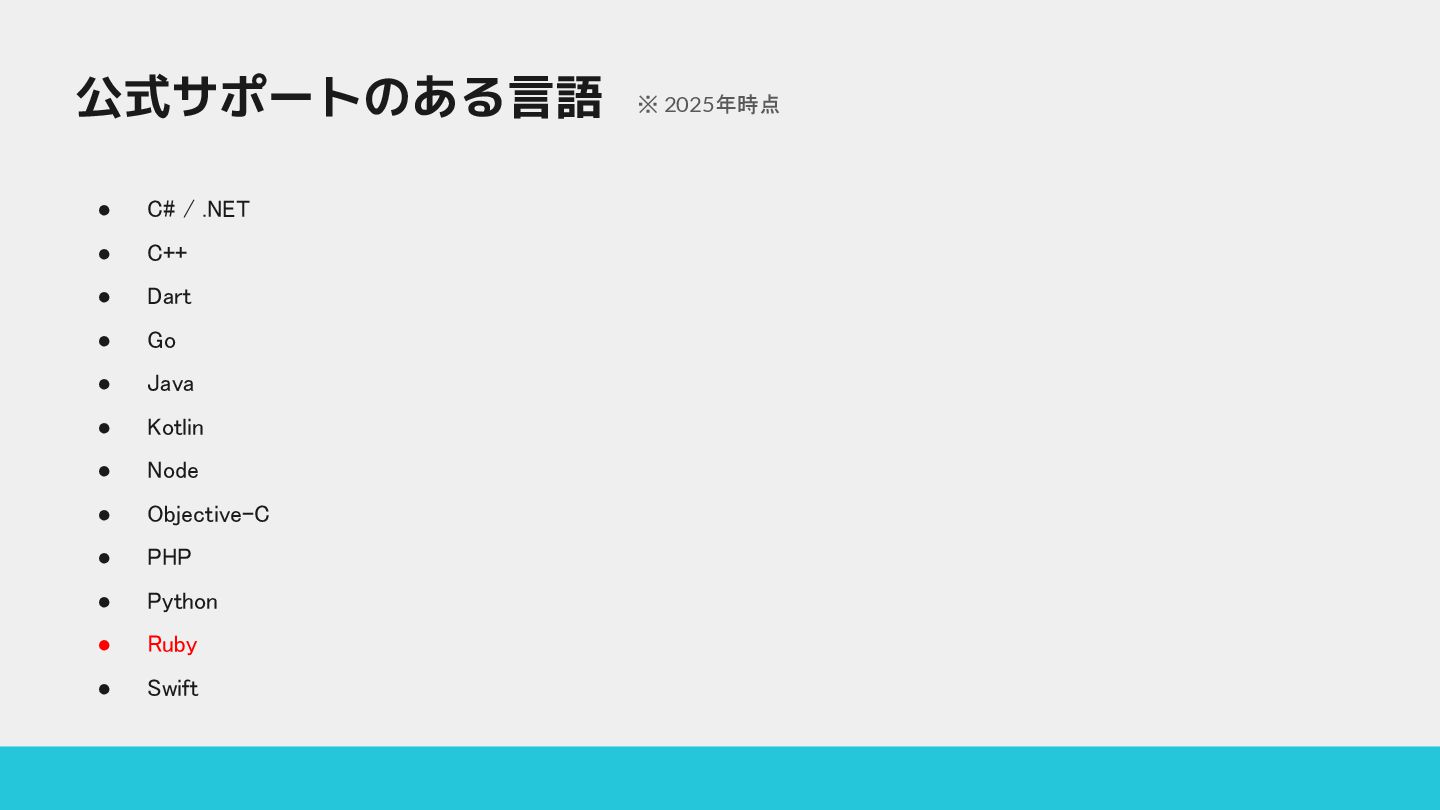• Java • Kotlin • Node • Objective-C • PHP • Python • Ruby • Swift 公式サポートのある言語 ※ 2025年時点